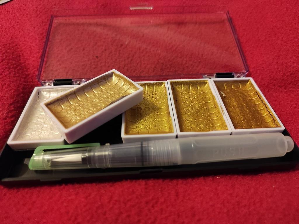 The best gold paints - I recommend! 😊 - They're great with water - They're very pigmented - After drying, they do not crack - They have a wonderful shine, even after drying 😍 - Large package! When I received the order (very quickly, by the way), I was surprised by the size of the package. The box of paints is much bigger than I imagined! In such amounts, the paints will last for a very long time. For this postcard, I used maybe a little paint from one cassette, and there are several colors and there is a lot of each! 😍 The package also includes a watercolor brush with a built-in water container. In this project I used a different brush, because I wanted details, but the brush from the set will definitely be great for larger surfaces. For the price - I wouldn't think twice. It's really worth buying them 😊