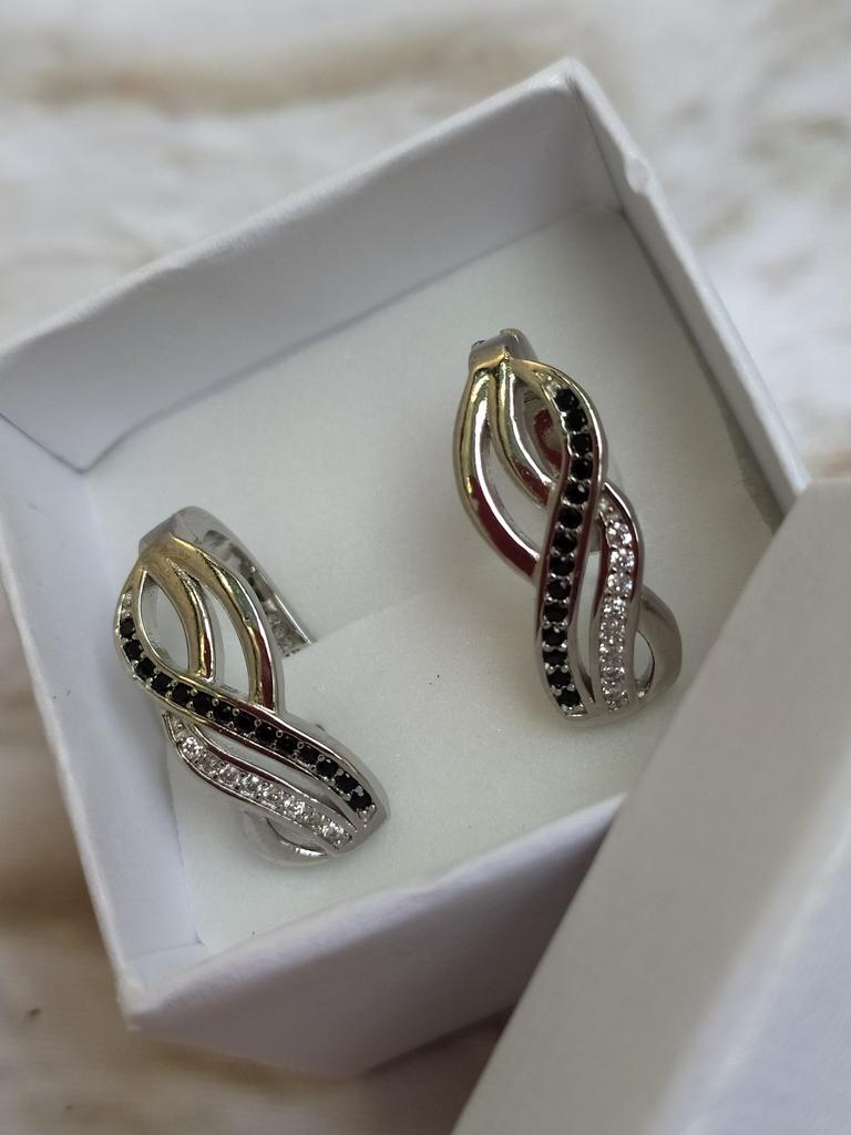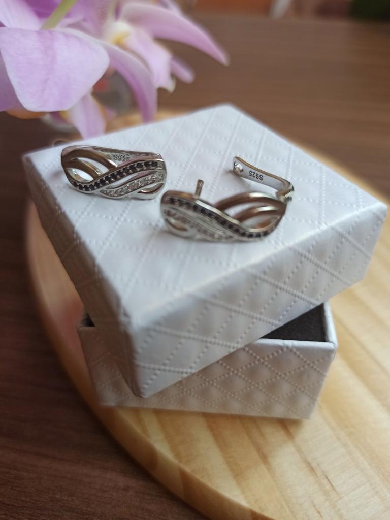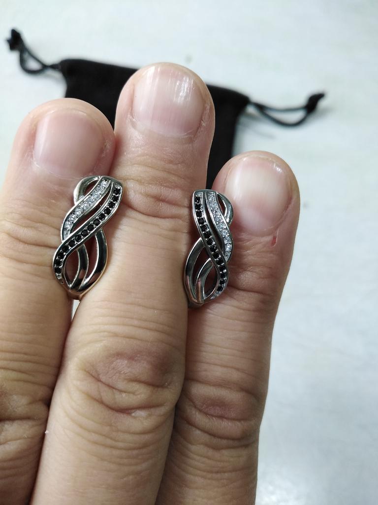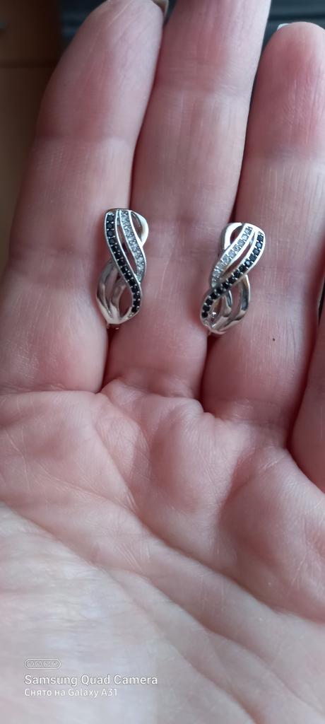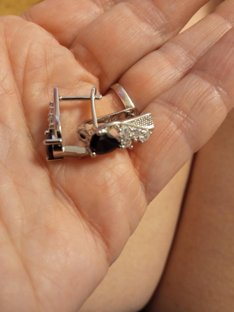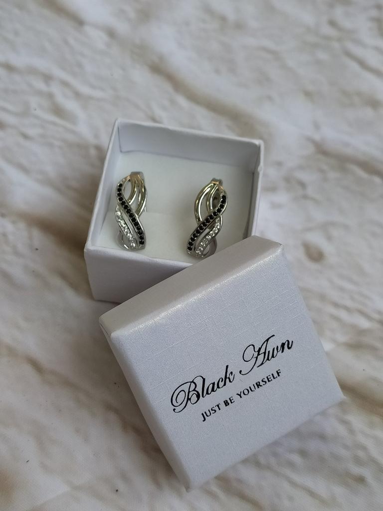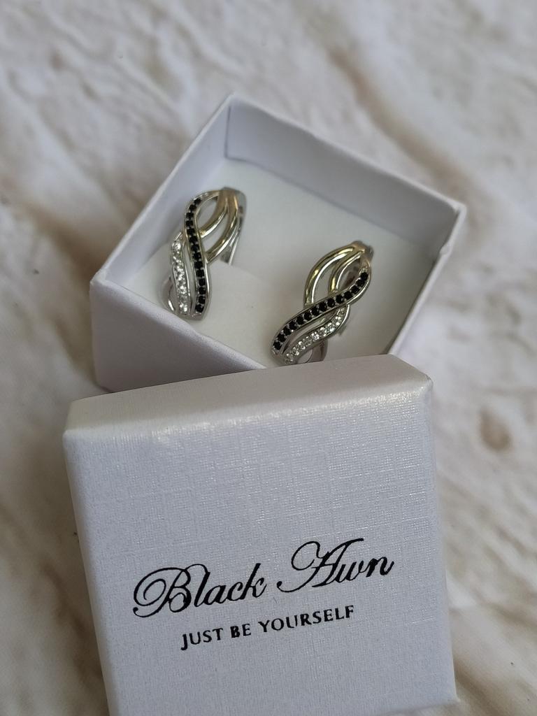 Earrings for women, tm Black Awn. ✈️Order delivery - 20 days. ✉️Packaging: envelope with air bubbles and branded cardboard box. 👩🔬Each earring has inserts of black and transparent stones, which have a very good jewelry shine. The inserts are made symmetrically. Although it is jewelry, but made very well. These earrings for everyday use, or as a gift - a very good option. And from my own experience I will say that from the outside these earrings look very "jewelry", because I have been asked so many times: "for how much did you buy these silver earrings?". What not to count! The most interesting thing is that no one believed that they had such a price! Fastener type: English lock. There is a sample. The color of the metal is similar to silver. The length of the outside earrings is about 2 cm. Length on the inside is about 1.3 cm. 🙂These earrings will perfectly complement business or casual clothes, and will go well with an evening dress. Earrings are not heavy, made very neatly and look very elegant, like real jewelry. 💳Price on the day of purchase 72 UAH. ✅The appearance of the earrings fully corresponds to the seller's photo. The purchase was a pleasure - the earrings are high quality, look great and are moderate! The seller is trustworthy! # The latest photos compare in size with other earrings. 🎁 If you want to receive earrings in a gift cardboard box, instead of a bag, order 2 items in this store at once.