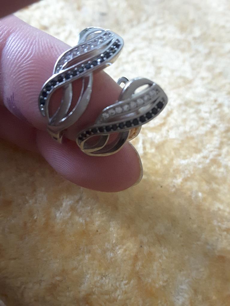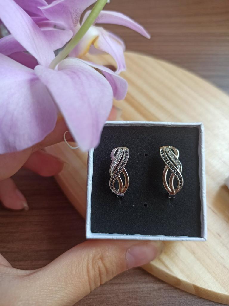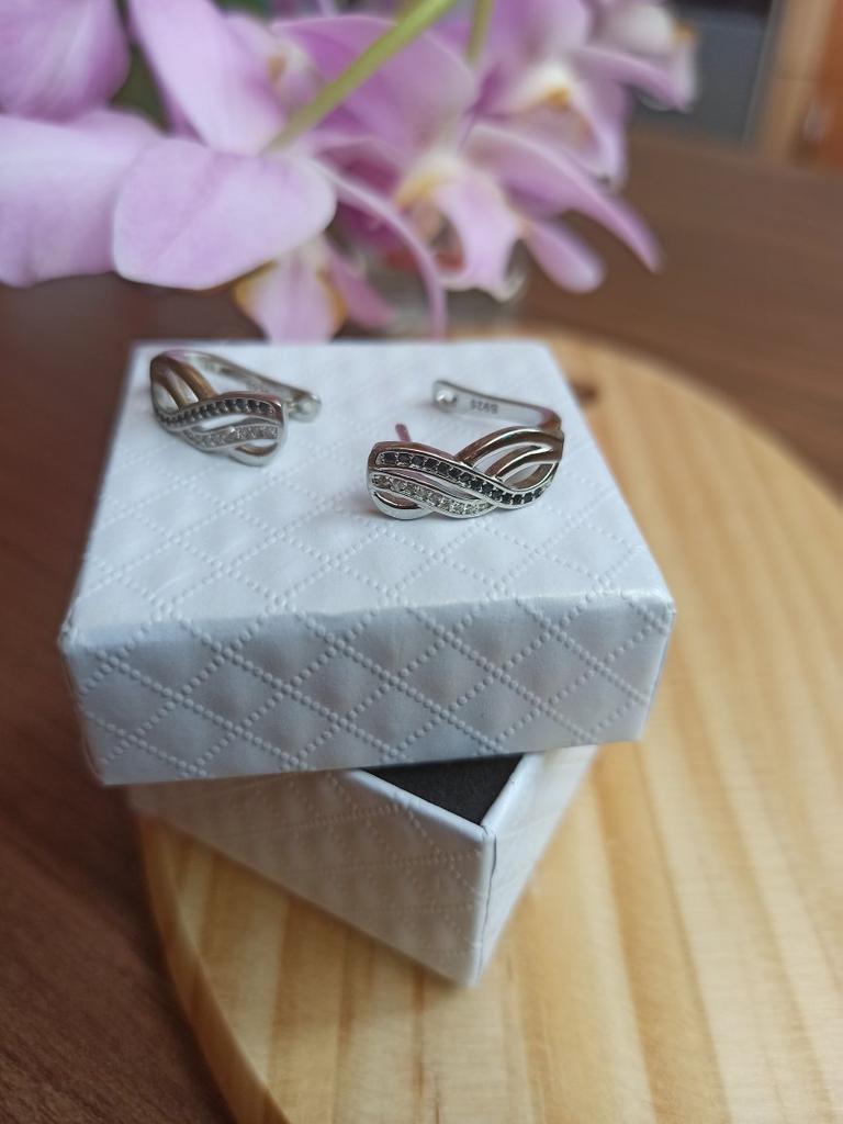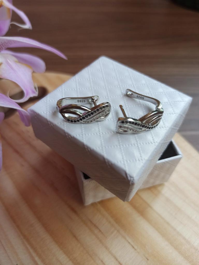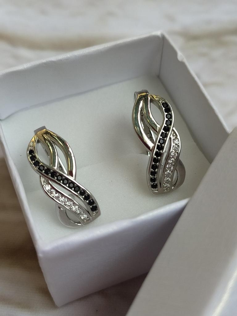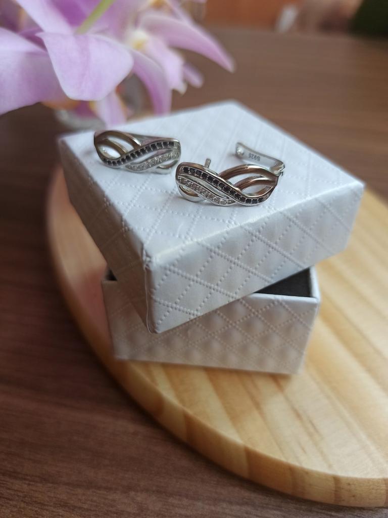 Earrings for women, tm Black Awn. ✈️Order delivery - 20 days. ✉️Packaging: envelope with air bubbles and branded cardboard box. 👩🔬Each earring has inserts of black and transparent stones, which have a very good jewelry shine. The inserts are made symmetrically. Although it is jewelry, but made very well. These earrings for everyday use, or as a gift - a very good option. And from my own experience I will say that from the outside these earrings look very "jewelry", because I have been asked so many times: "for how much did you buy these silver earrings?". What not to count! The most interesting thing is that no one believed that they had such a price! Fastener type: English lock. There is a sample. The color of the metal is similar to silver. The length of the outside earrings is about 2 cm. Length on the inside is about 1.3 cm. 🙂These earrings will perfectly complement business or casual clothes, and will go well with an evening dress. Earrings are not heavy, made very neatly and look very elegant, like real jewelry. 💳Price on the day of purchase 72 UAH. ✅The appearance of the earrings fully corresponds to the seller's photo. The purchase was a pleasure - the earrings are high quality, look great and are moderate! The seller is trustworthy! # The latest photos compare in size with other earrings. 🎁 If you want to receive earrings in a gift cardboard box, instead of a bag, order 2 items in this store at once.