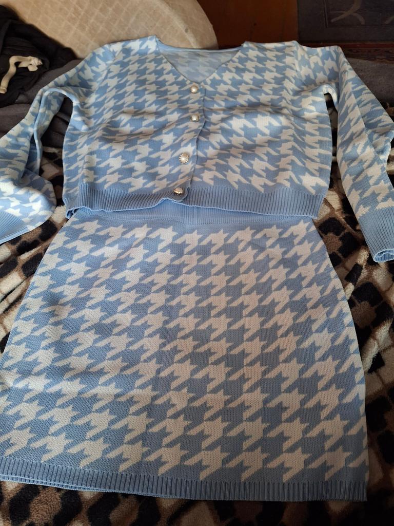 YYFS Women's Fashion Casual Houndstooth Print Autumn Winter Long Sleeve V-Neck Skirt Suits