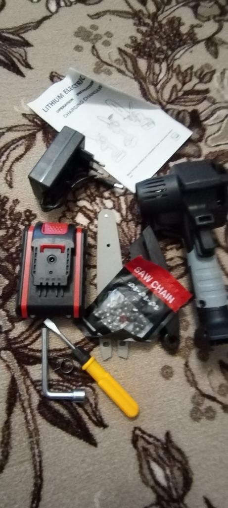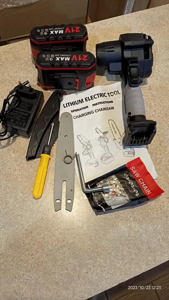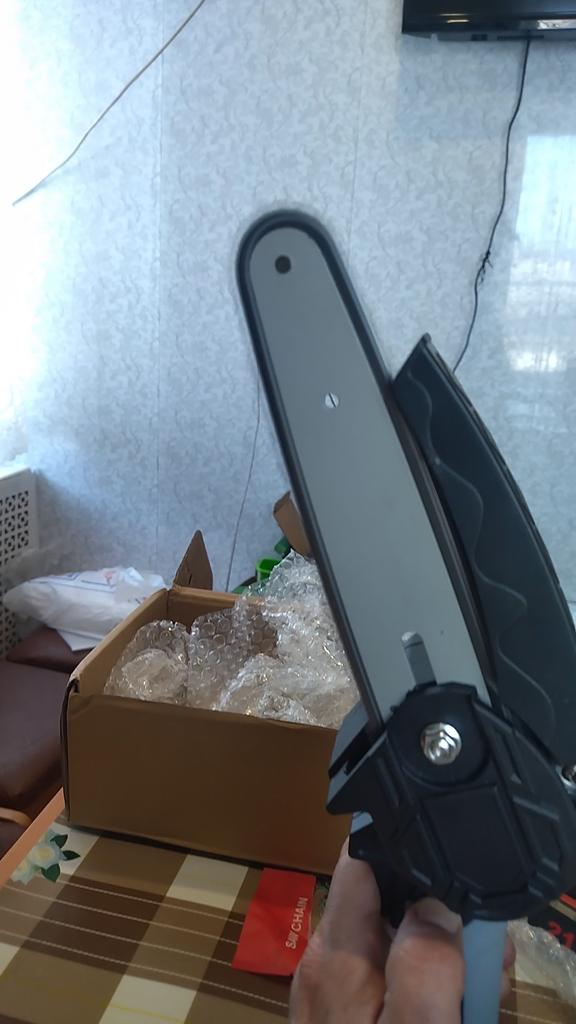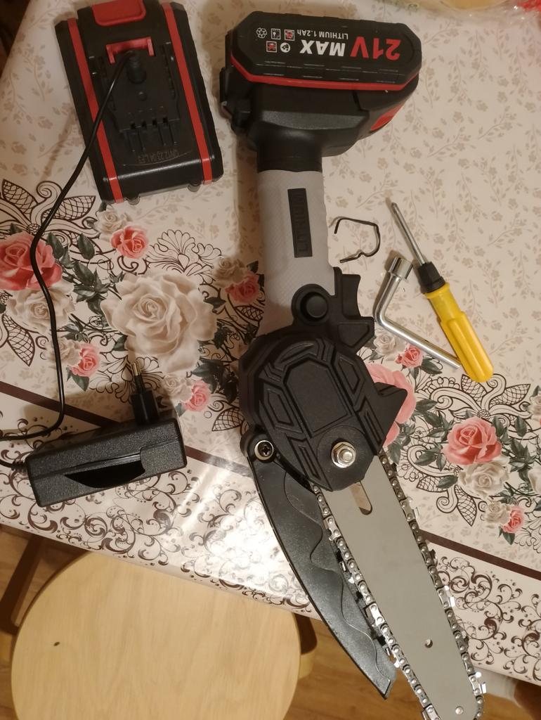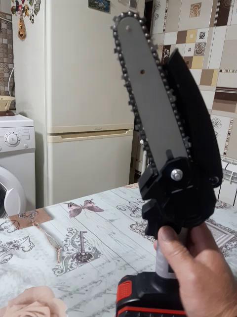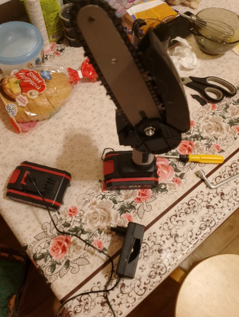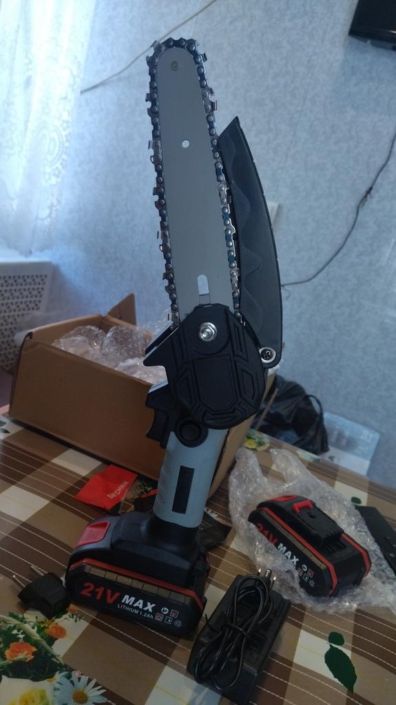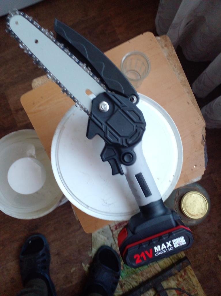 The saw is not bad, there is enough power, the battery runs out in 25-35 minutes of work! The chain during operation must be periodically lubricated and tightened. Pulling with a screwdriver is very inconvenient and miserable! It is better to saw not thin branches and to focus or hold a branch so that the saw does not pull back and forth. Ideally, sawing trunks of 5-10 cm. If you still make a movement as if you are sawing with a hand saw, then it is even better and faster to cut. They make me an adapter for battery norms, then it will be super