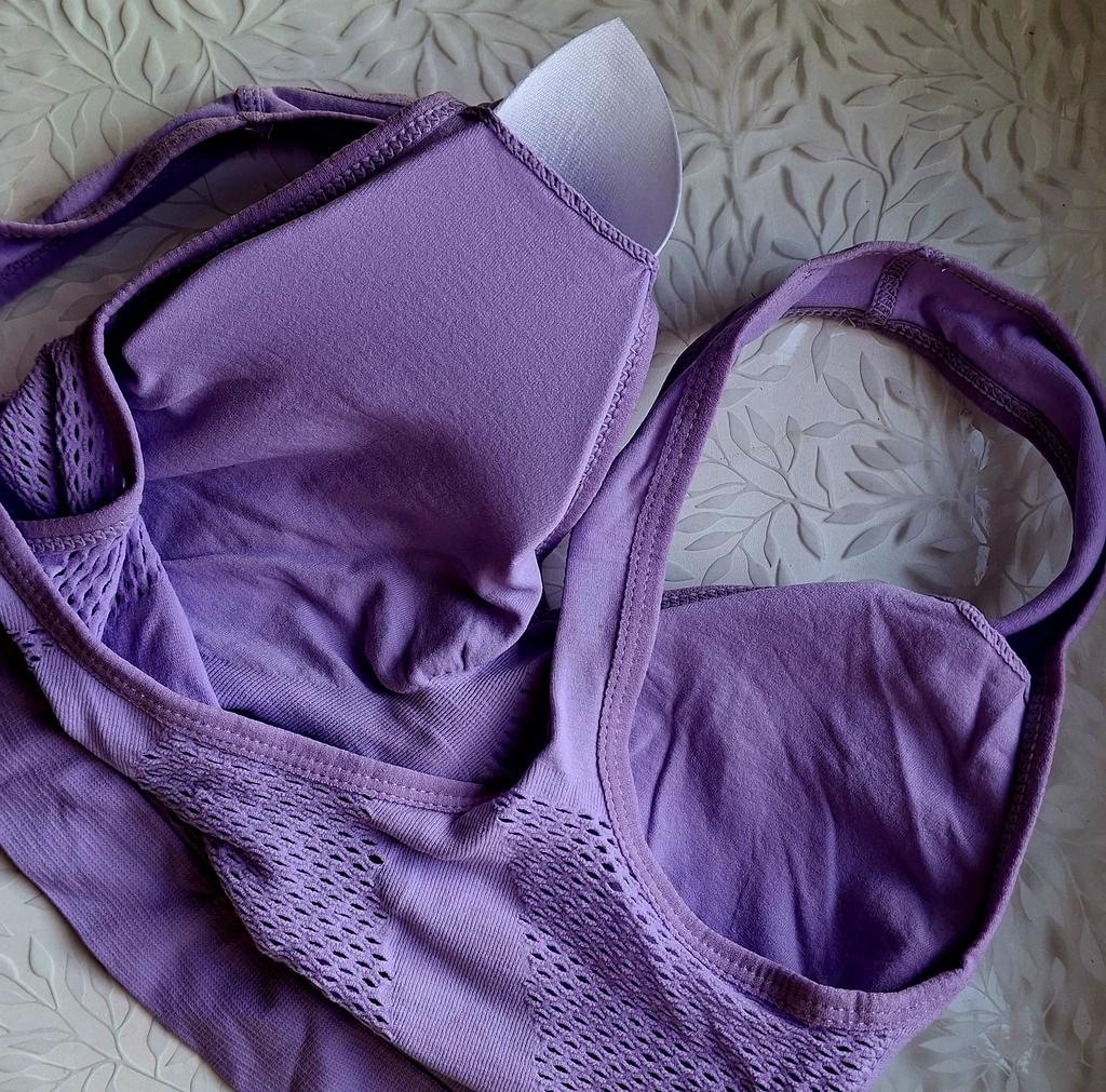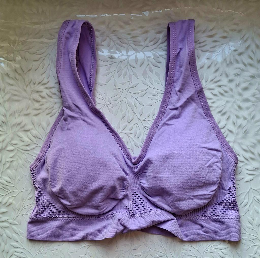 The color is not purple, but closer to asphalt. The cup size is very small, and the straps stretch a lot, causing the breasts to sag. Whether with it or without it... Money down the drain, which is a shame, I was really looking forward to it, as after a broken arm, it's difficult to put on a regular bra.