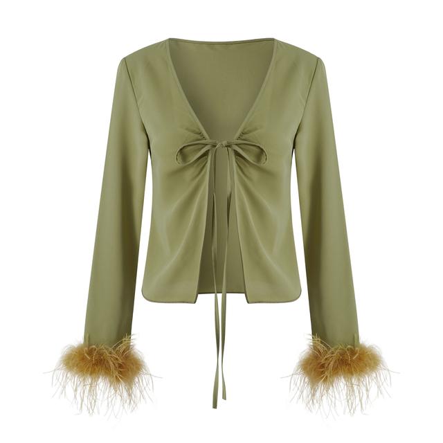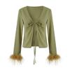 Women Spring Autumn Crop Tops Long Sleeve V-neck Lacing Feather Slim Fit Autumn Shirts for Club Party