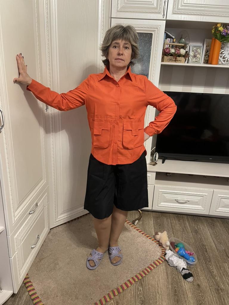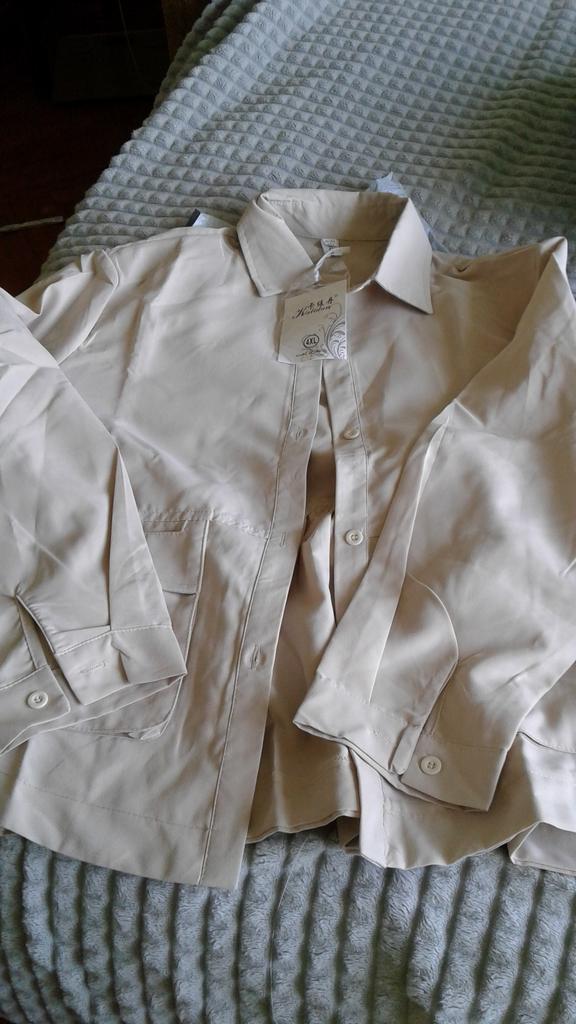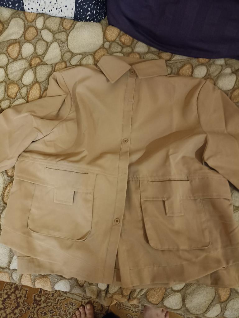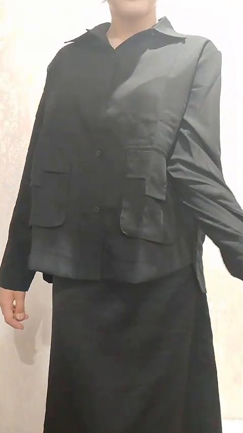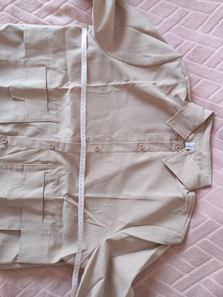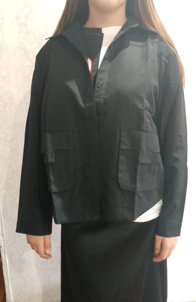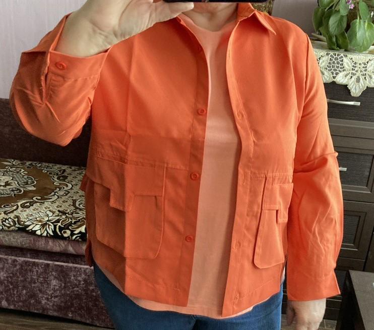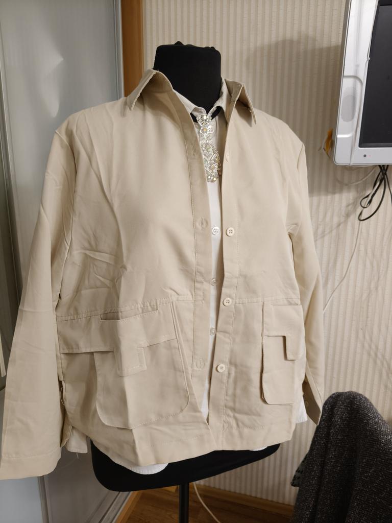 Jacket-shirt for warm season, the quality of the fabric, tailoring is excellent, the fabric is similar to thick satin, the style is unusual. The front is a little shorter than the back, the pockets are a little high, but this is the style, on the back there is a yoke at the waist, the sleeve is on the cuff, on the button. The shirt can only be worn loose, you can not tuck it in, those who are taller than 165 cm will have short sleeves.