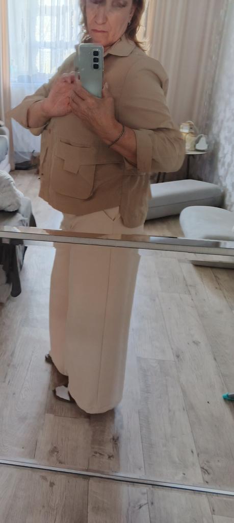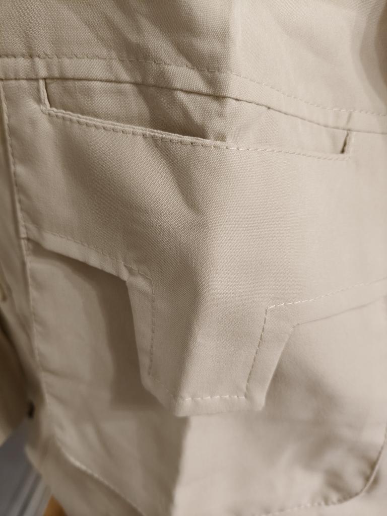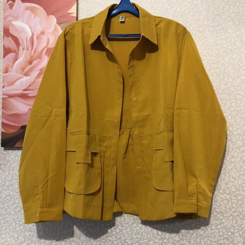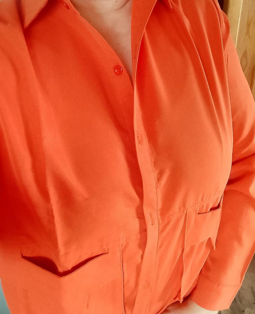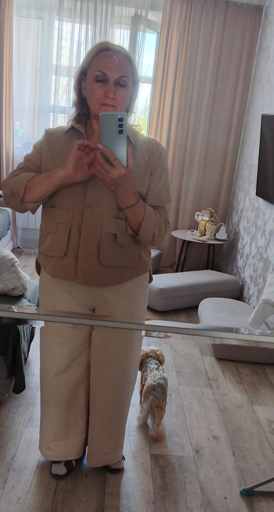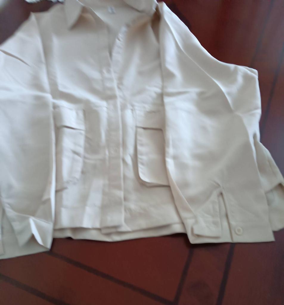 Jacket-shirt for warm season, the quality of the fabric, tailoring is excellent, the fabric is similar to thick satin, the style is unusual. The front is a little shorter than the back, the pockets are a little high, but this is the style, on the back there is a yoke at the waist, the sleeve is on the cuff, on the button. The shirt can only be worn loose, you can not tuck it in, those who are taller than 165 cm will have short sleeves.