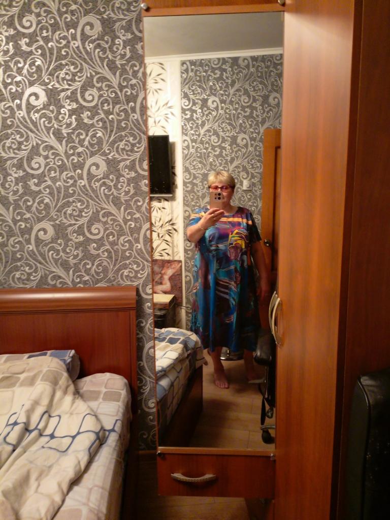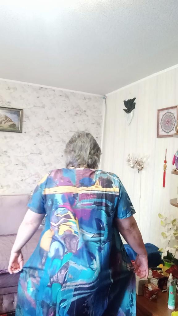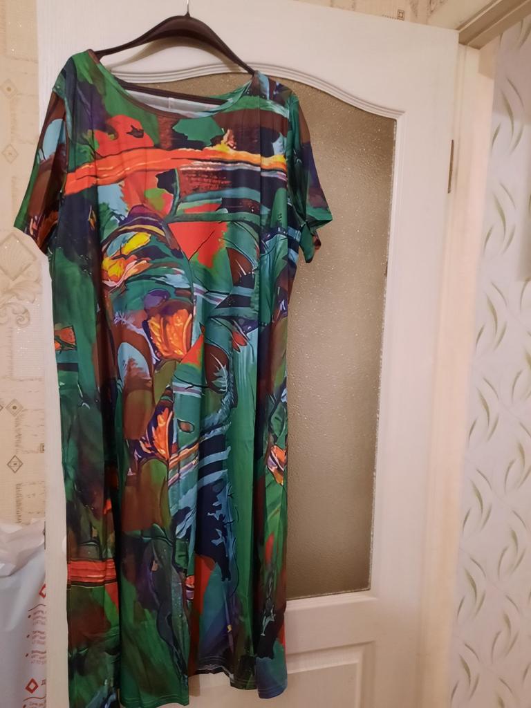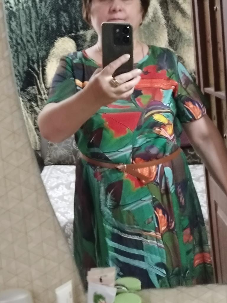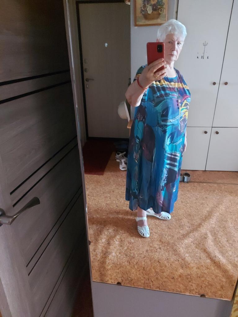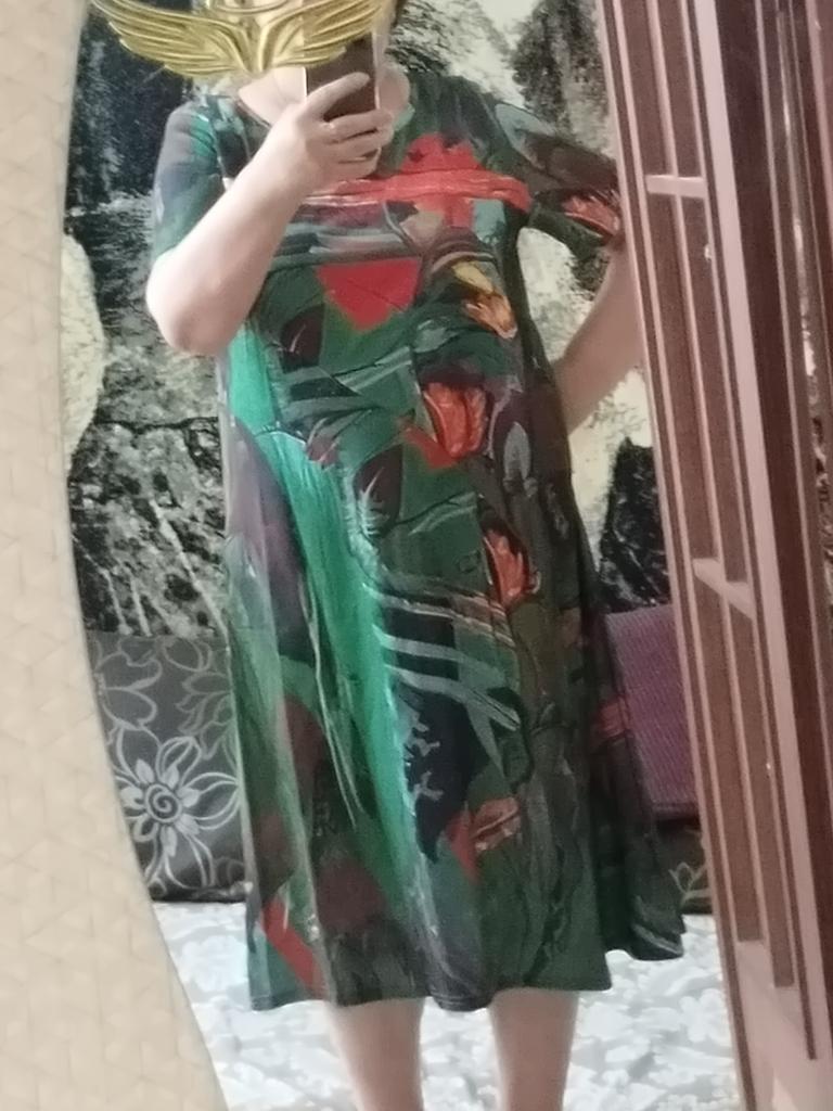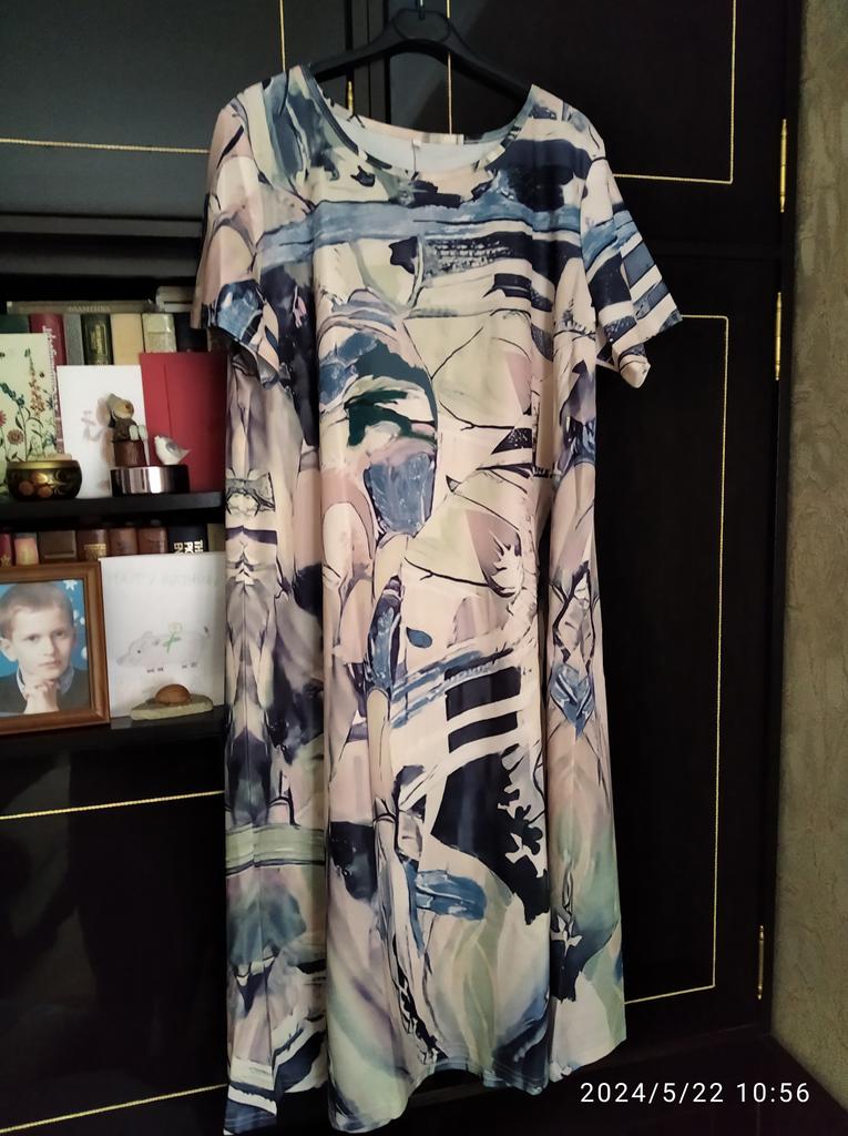 Great dress, beautiful color! I wear size 62-64, loose. The fabric is lightweight tricot, from the past, it doesn’t wrinkle.