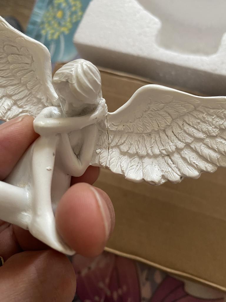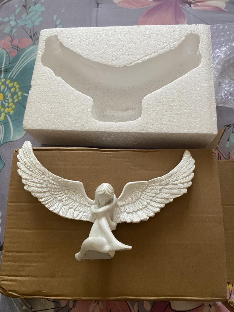 The angel is not bad, but it is absolutely useless as it does not sit and cannot even be attached with double-sided tape because it is too heavy and there is not enough space to grip. I think this is not a quality product because it should sit by itself and not fall.