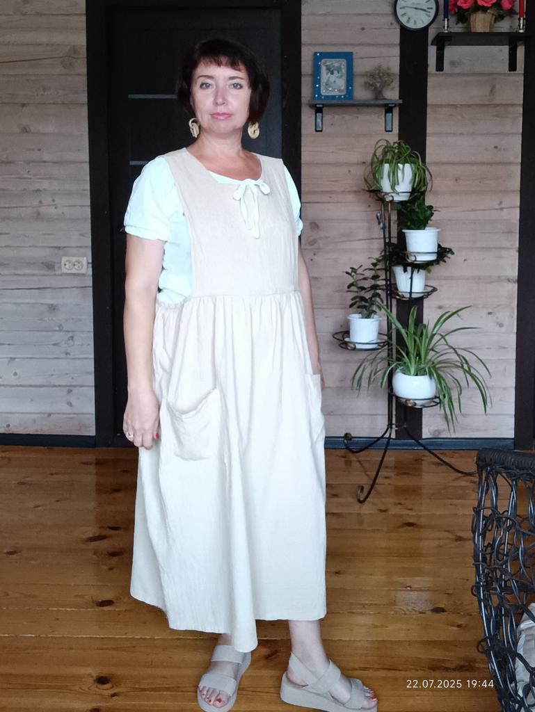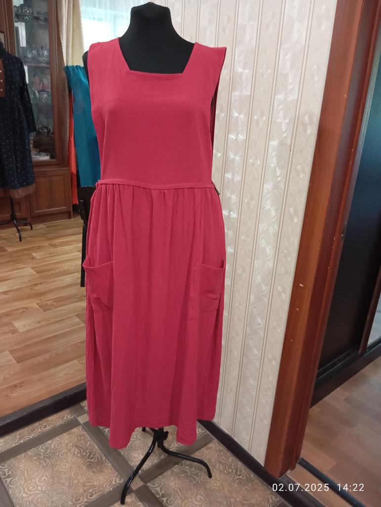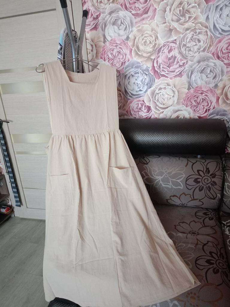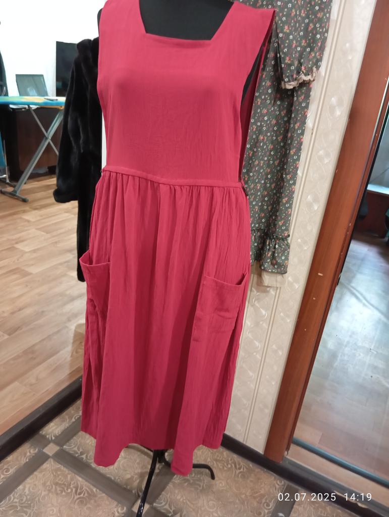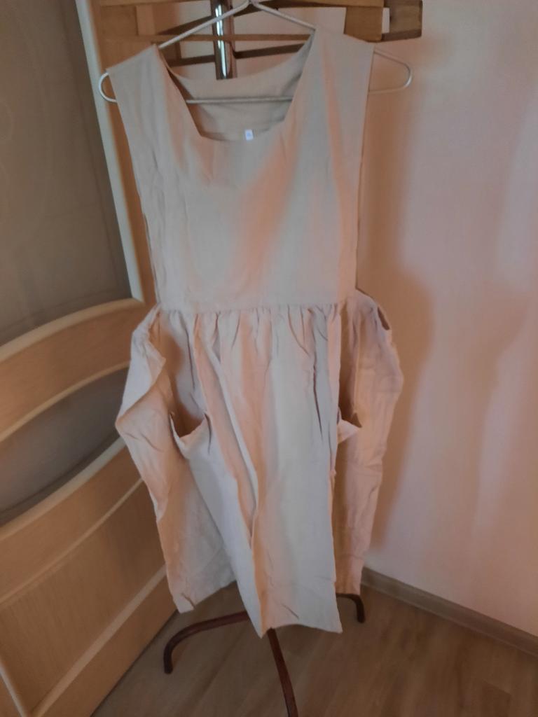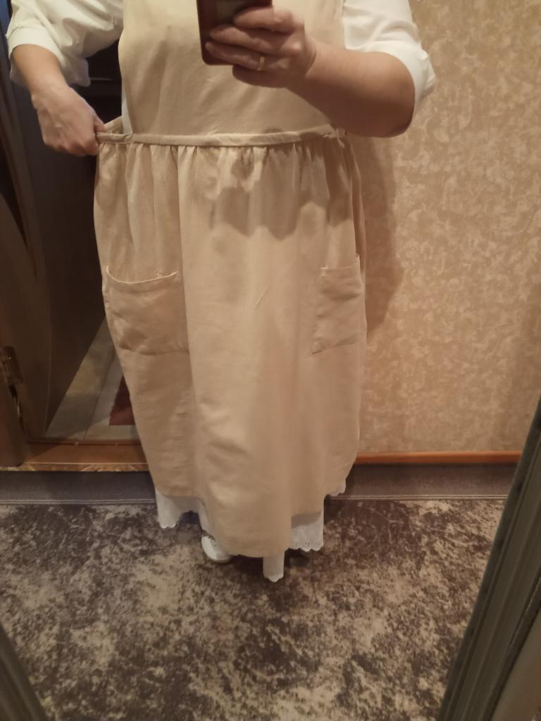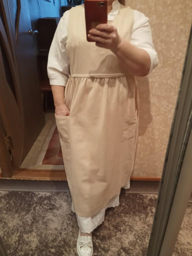 Interesting apron, probably will be comfortable in the summer, to be bustling around the kitchen in the heat. Only very bulky, increases the dimensions. Sewn neatly, no threads sticking out. The fabric is a blend, looks like cotton. For my size 50-52, it's just right