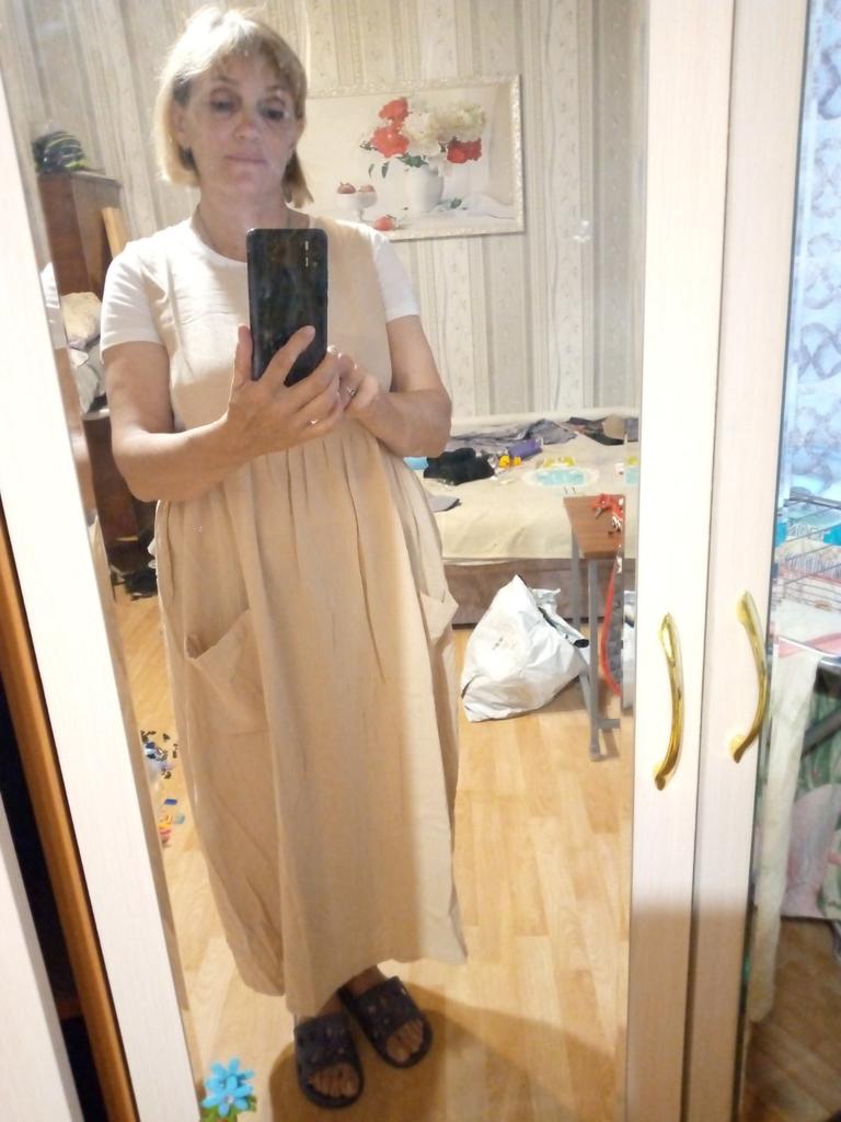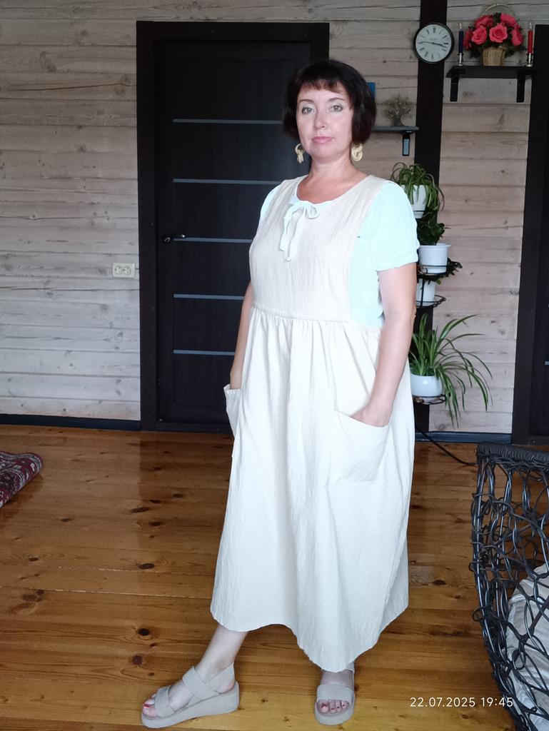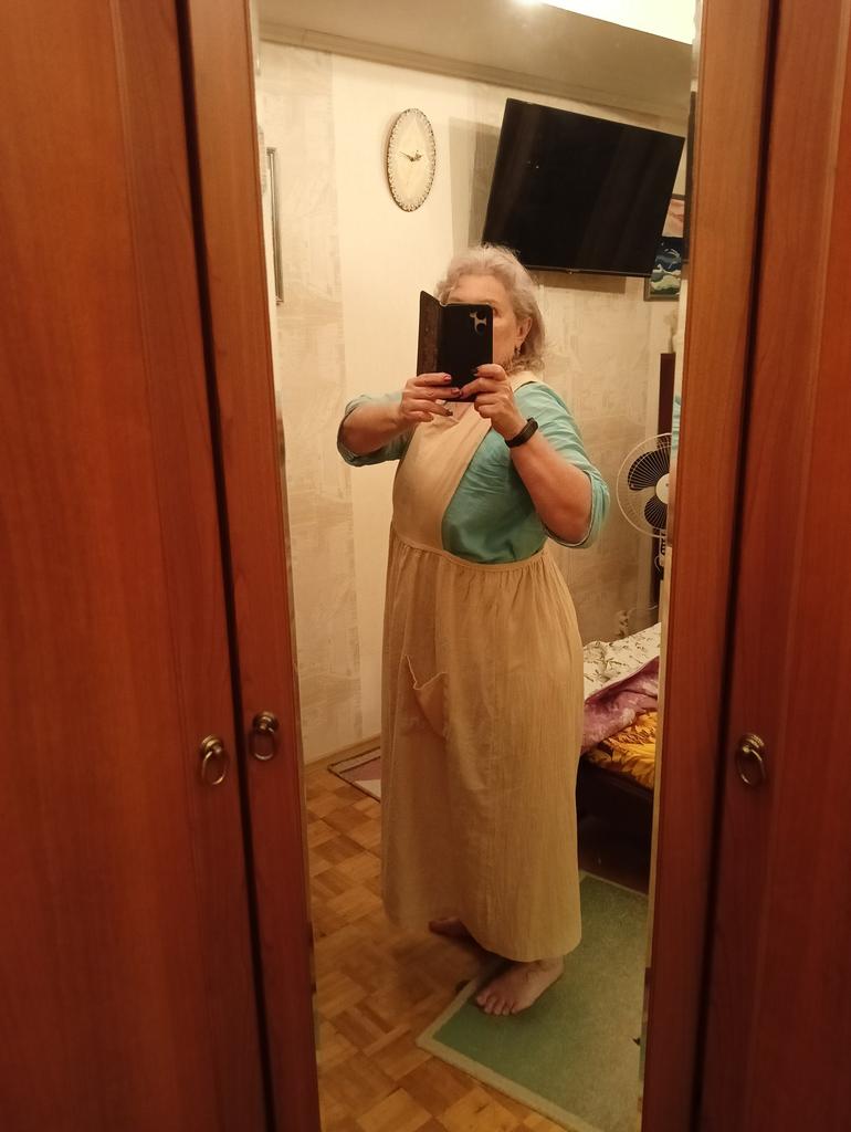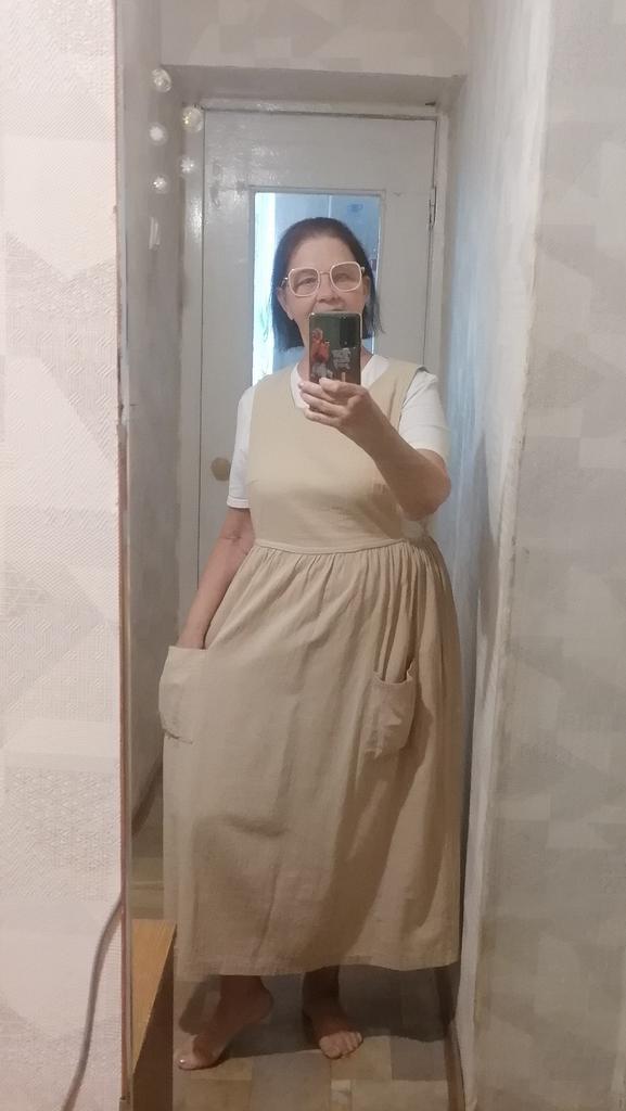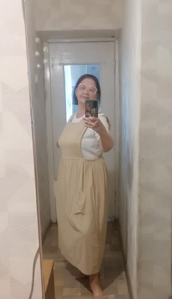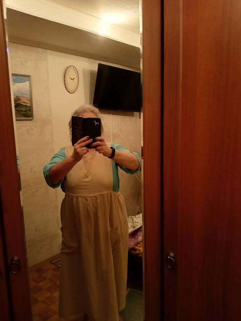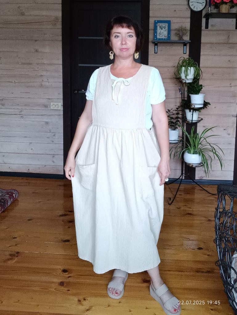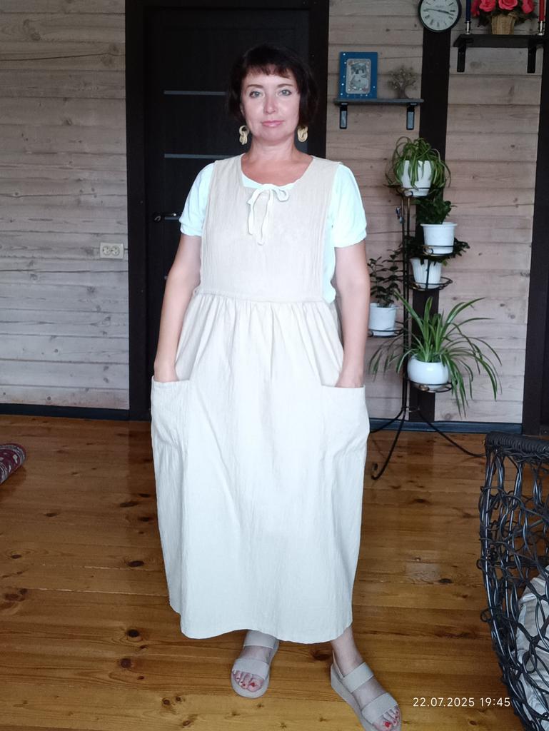 Interesting apron, probably will be comfortable in the summer, to be bustling around the kitchen in the heat. Only very bulky, increases the dimensions. Sewn neatly, no threads sticking out. The fabric is a blend, looks like cotton. For my size 50-52, it's just right