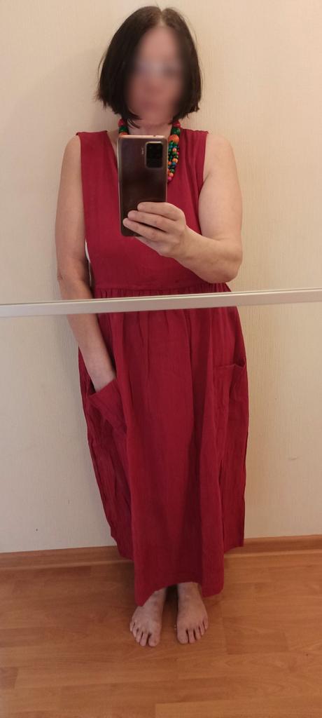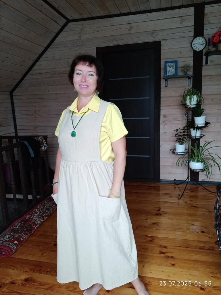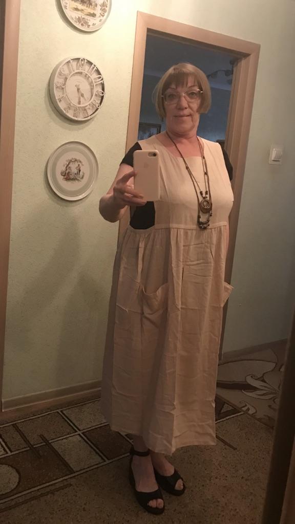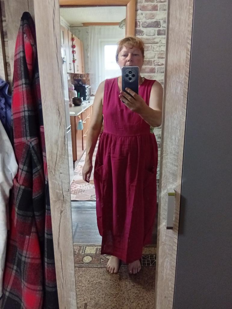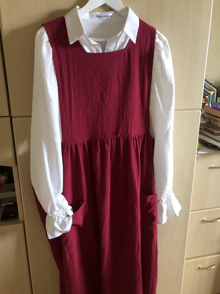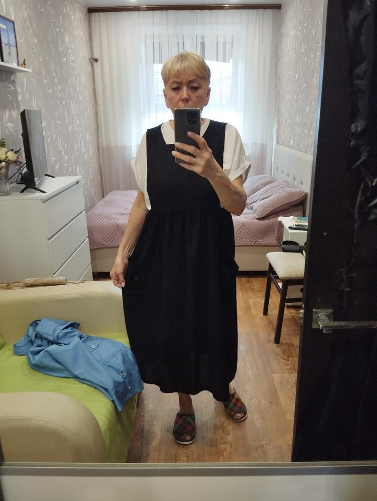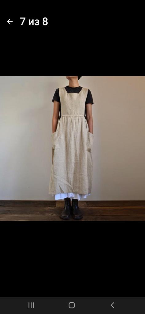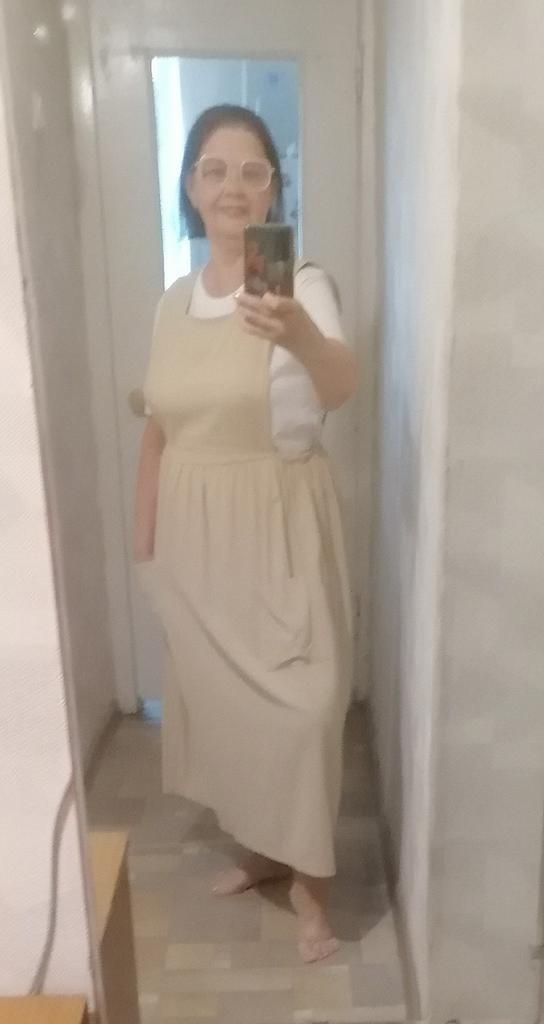 Interesting apron, probably will be comfortable in the summer, to be bustling around the kitchen in the heat. Only very bulky, increases the dimensions. Sewn neatly, no threads sticking out. The fabric is a blend, looks like cotton. For my size 50-52, it's just right