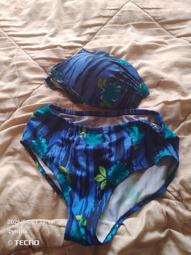 The swimsuit fits 52-54. The color is bright, like in the picture, the material is thick.