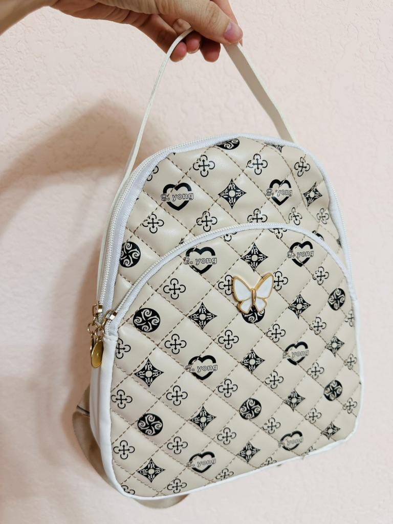 Nice backpack. Looks pretty decent, despite the low price.. This is quite a voluminous backpack, its dimensions are 25x20 cm. It looks neat and will fit everything you need.. Besides, the backpack is very light.. I chose the simplest color, black. It will go with everything, and you can wear it in both winter and summer.. Quilted backpack. Gray monograms on a black background. On the front there is a large pocket with a zipper. The backpack is fastened with a zipper, inside there is one compartment. The lining is satin, black. The straps are the same color as the backpack, black, also with monograms. They are adjustable.. As decoration - a metal butterfly. All fittings are beautiful gold color.