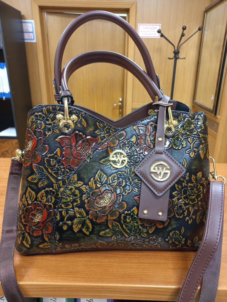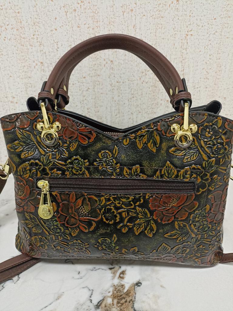Very beautiful, the green color of the leaves will probably be noticeable outside. The hardware is great. There is a lot of space inside and two more small pockets. The front and back compartments close with a button. The back pocket closes with a zipper. Special thanks for the packaging. The box, the bags, and another bag, and it was tightly packed with paper inside. No deformation.