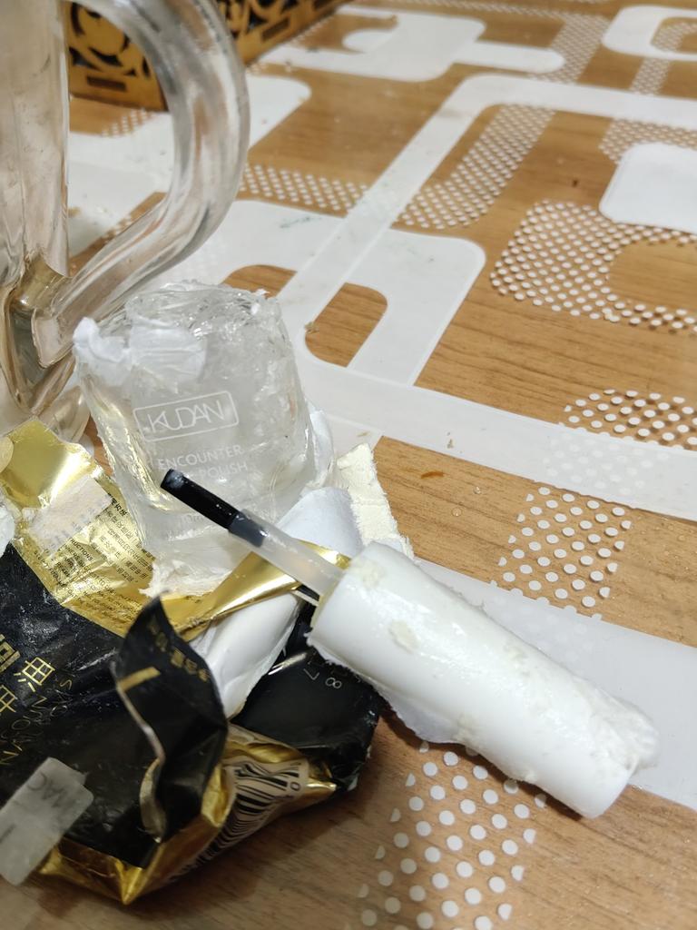 The bottle is cracked and the contents (varnish) are leaking out, apparently due to the decoration that was included as a gift, it's a great pity
