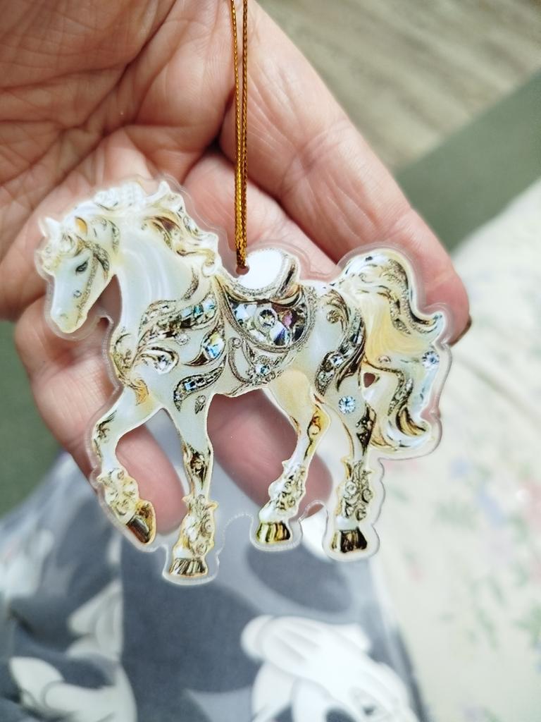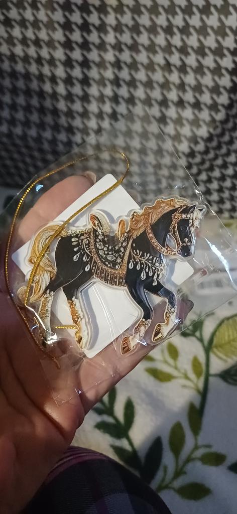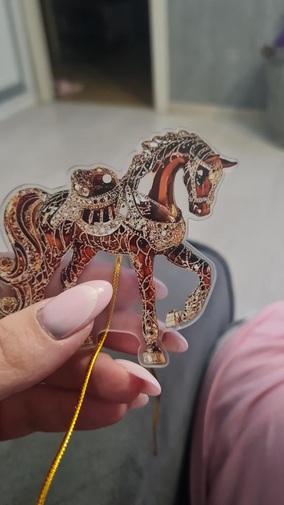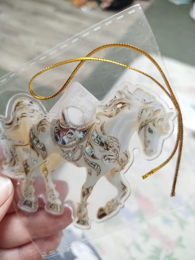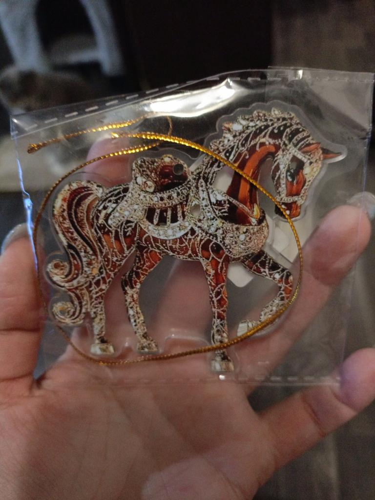 Flat little horse, very beautiful. The ribbon is next to it in the package, it needs to be threaded through the hole and hung on the Christmas tree๐ฒ