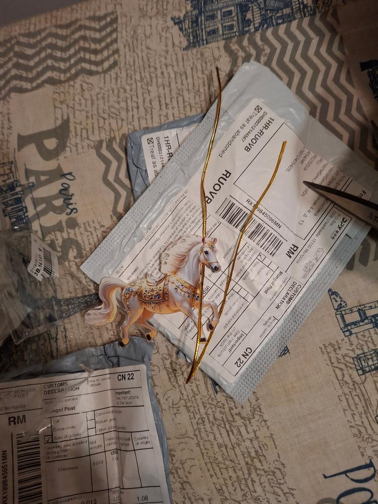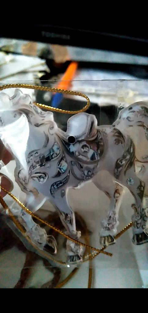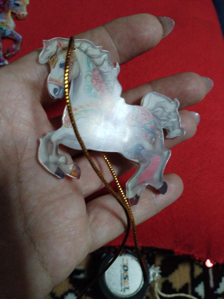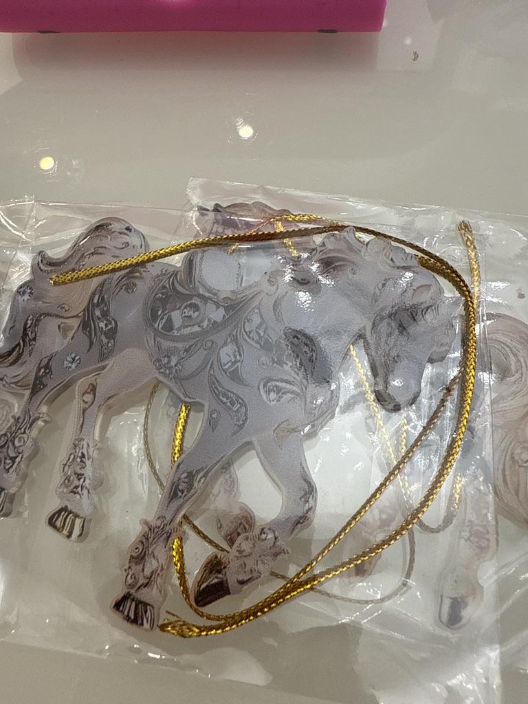 Flat little horse, very beautiful. The ribbon is next to it in the package, it needs to be threaded through the hole and hung on the Christmas tree๐ฒ