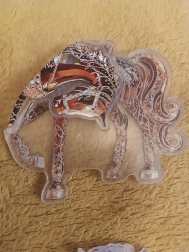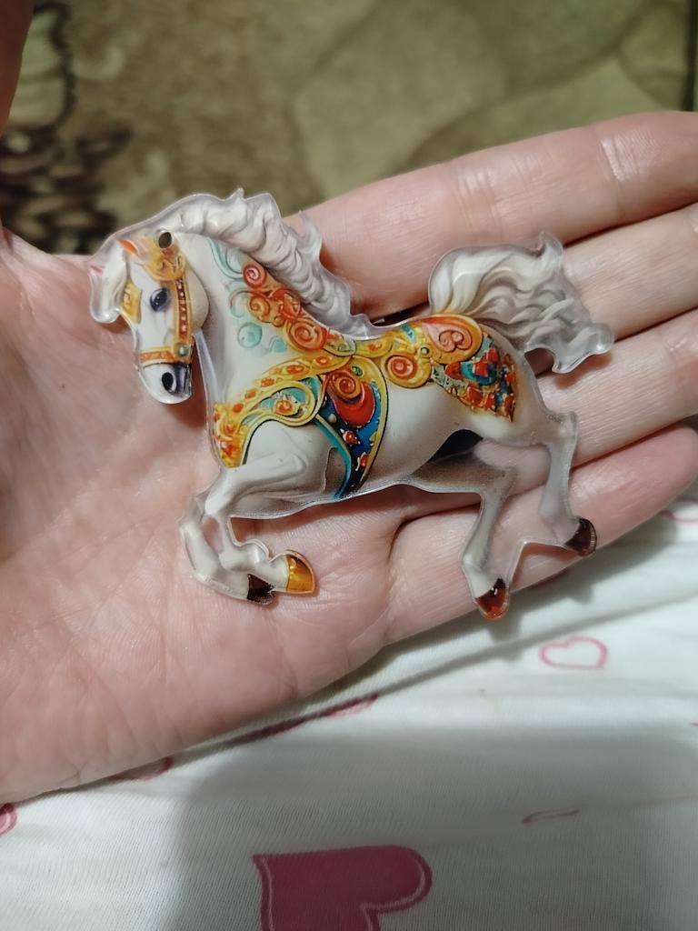 I thought they would be three-dimensional, but they turned out to be flat pictures on a hard base. Quite nice, but I regret not reading the reviews. I didn't notice right away that one horse broke in transit ๐ it's held on by film on one side, now it's visible that it's made on the basis of transparent plastic, like plexiglass.