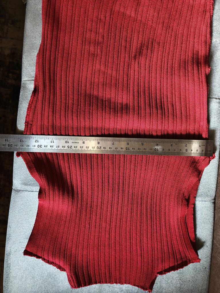 The whole tank top is made of two identical pieces with seams on the sides - neckline, shoulder, sides. Very small, like a child's. The color is not burgundy, not red, more reddish, indistinct. The knitwear is coarse.