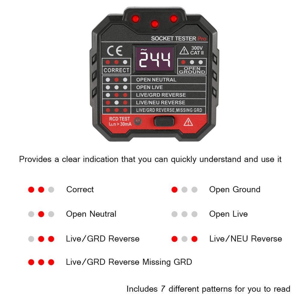 It has a large and easy read fault chart. Includes 7 different patterns for you to read: Correct, Open Ground, Open Neutral, Open Live, Live GRD Reverse, Live NEU Reverse, Live GRD Reverse Missing GRD. Provides a clear indication that you can quickly understand and use it.