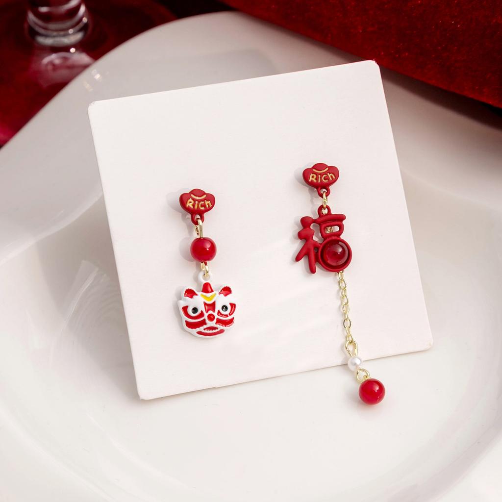 Red Festive Lion Pearl Earrings, National Style Asymmetrical Ingot Blessing Character Fringed Stud Earrings Female