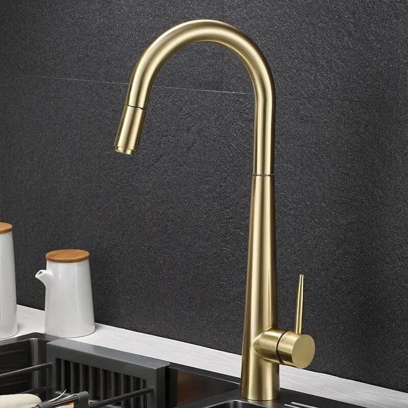 Brushed Gold Pull Out Kitchen Faucets Brass Lead Free Sink Faucets Sink Tap Rotating Spout Mixers Tap Hot Cold Water Crane