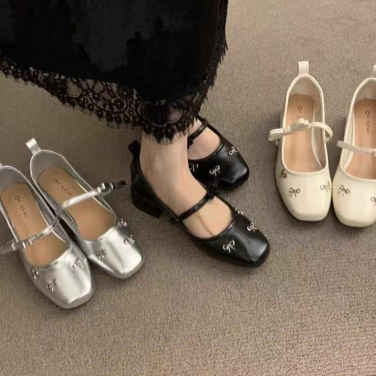 Design Sense Silver Thick Heel Single Shoes Women's Light Mouth Mary Jane Shoes One-word Buckle Bow Versatile Small Leather Shoes Tide