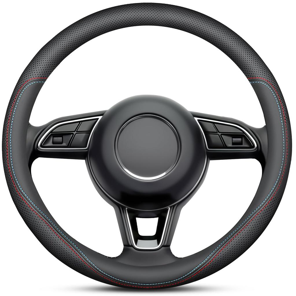 [Ideal Operation and Design] The perfectly designed thickness, neither too thick nor too thin, compensates for the narrowness of the stock steering wheel while providing a firm grip. The black base with red and blue double-color stitching adds an accent to the interior of your car, creating a sporty and stylish look.
