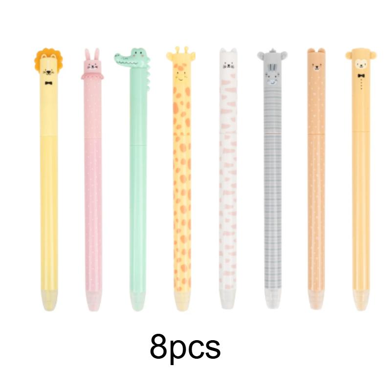 8pcs Cute Zoo Theme Erasable Gel Pen Set, 0.5mm Fine Point, Blue Ink, Built-in Eraser, Smooth Writing, Ideal for Note-Taking