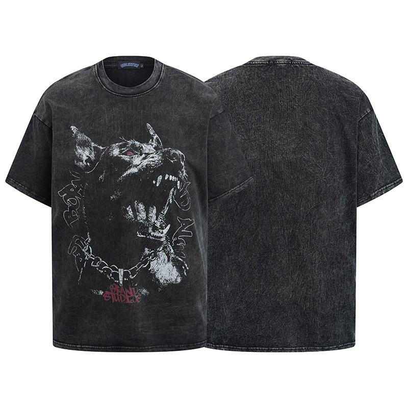 American Street Trend Men'S T-Shirt Hiphop Retro Doberman Print Loose Short-Sleeved Washed T-Shirt Men