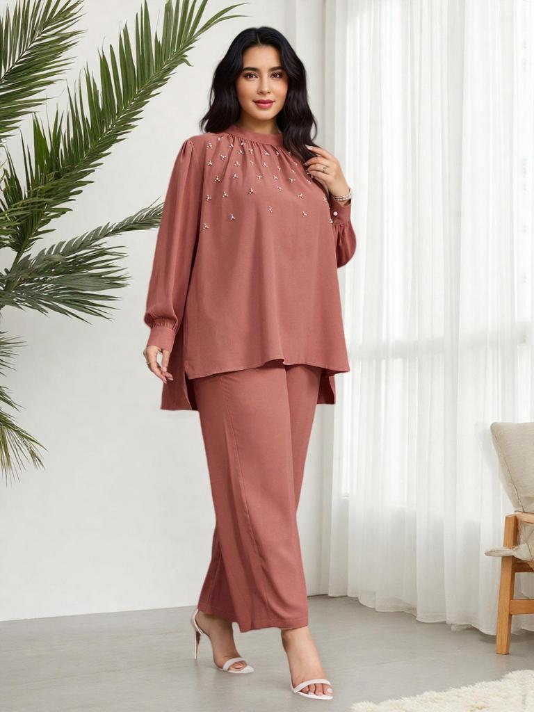This elegant two-piece set is designed specifically for plus-size women seeking comfort and style. It features a loose-fitting pink stand collar top embellished with delicate beadwork, paired with matching wide-leg pants. Both pieces are crafted from high-quality polyester, ensuring a soft feel and easy maintenance. Perfect for special occasions or casual outings, this set combines traditional Middle Eastern elegance with modern fashion sensibilities.
