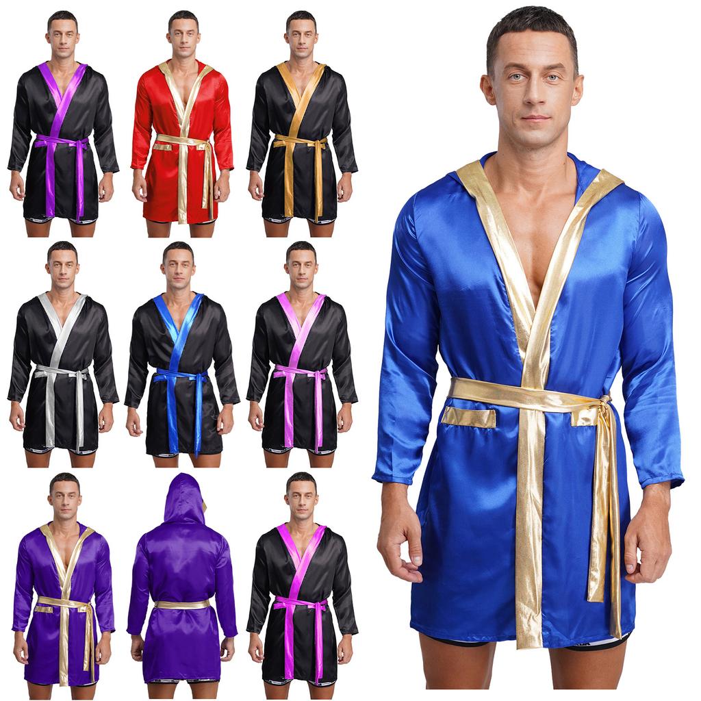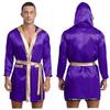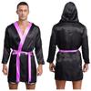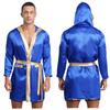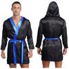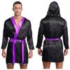 Mens Satin Hooded Cloak Shiny Trim Open Front Belt Boxing Robe