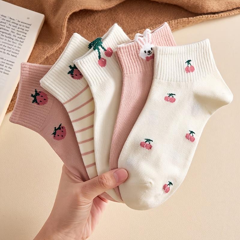 5 Pairs Women's Short Rib-Socks/Pink Cherry Strawberry Bunny Pattern/Comfortable Breathable Casual Street Style/Fruit