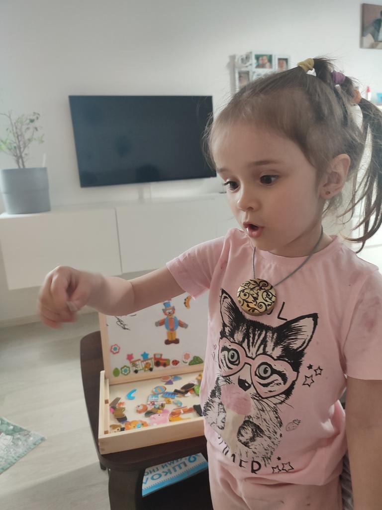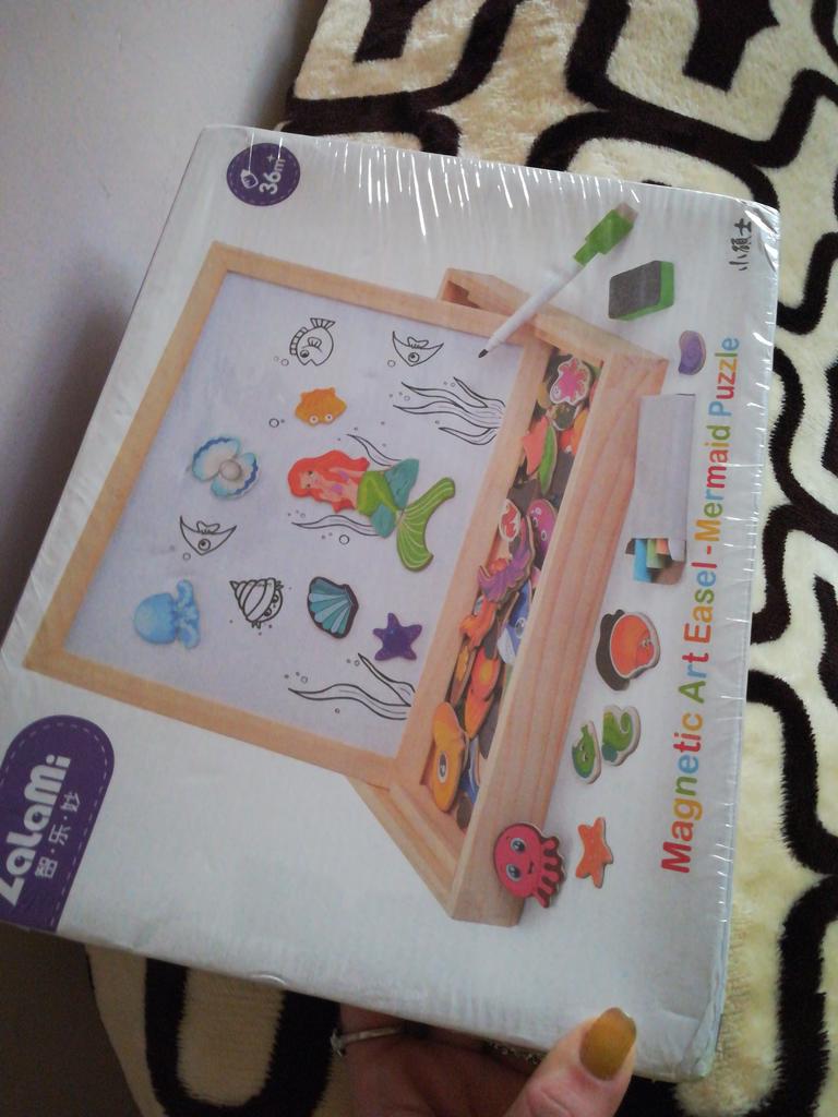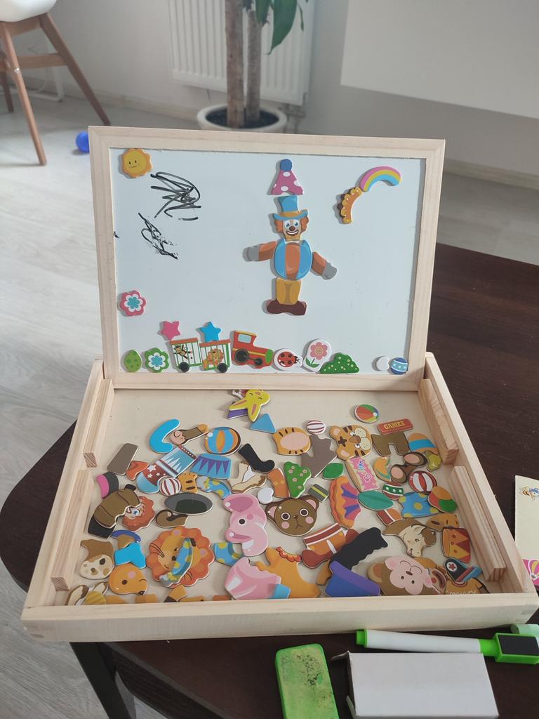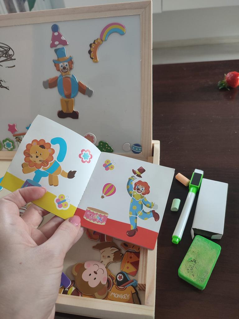 3-in-one game board, you can draw on the white side, on the blackboard and even assemble the pieces in the form of a puzzle. Ideal for small children (with supervision) since some pieces are very small.