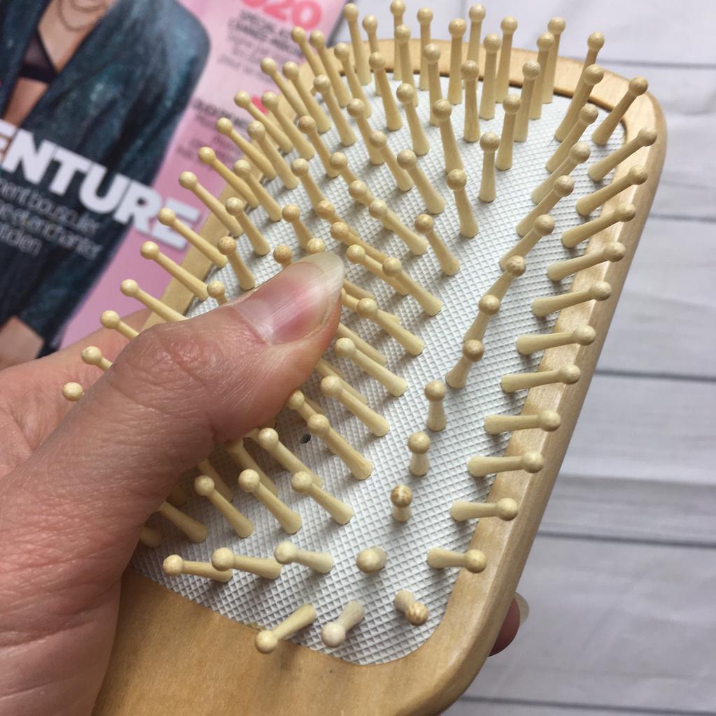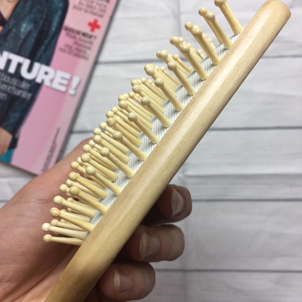 Hairbrush Delivery two weeks after placing an order, packing a plastic bag The hairbrush is small in size, a good option for a woman's handbag. Made of wood of good quality and durable in appearance. The wood is finished and the surface is smooth. The fingers of the brush are also wooden, and the pad is soft. It is pleasant to comb, the comb is soft, combes the hair well, without electrifying them. I recommend to purchase 👍