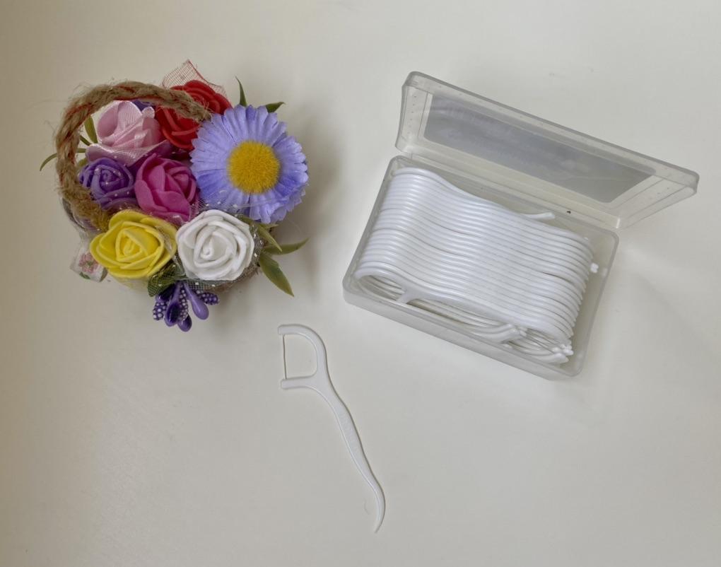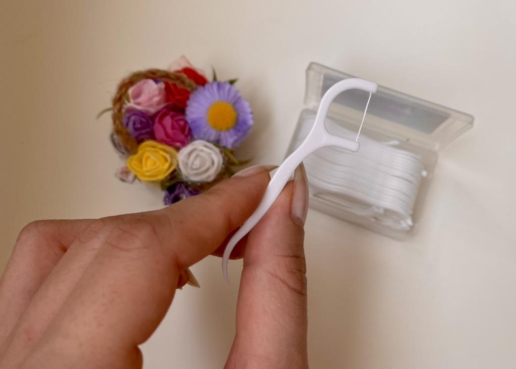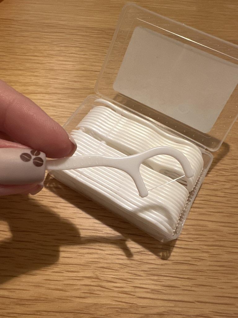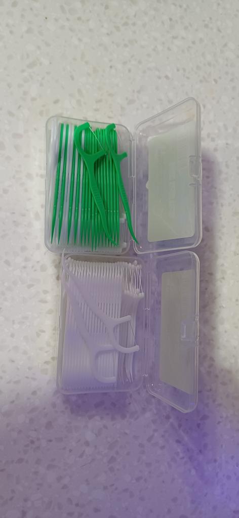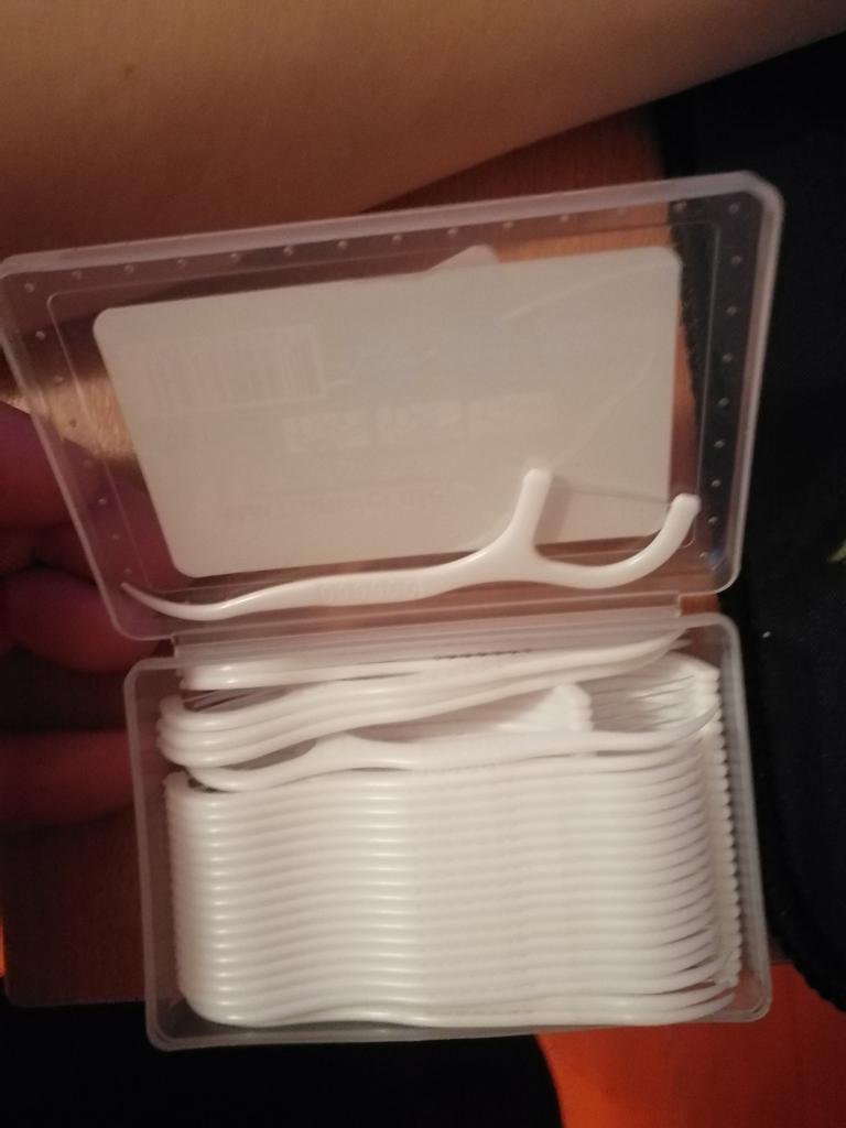 Dental floss and toothpick in one 🦷👍 Plastic toothpicks quite stiff and floss very well fixed. The gadget in a very pocketable version, it will fit even in a very small women's handbag 👍 Delivery is on time. The price is about PLN 15.80. for 50 pcs.