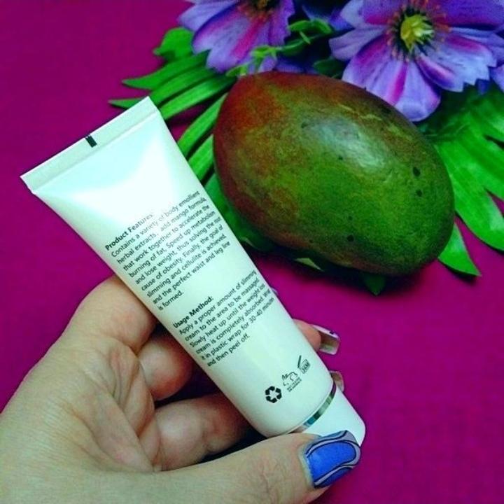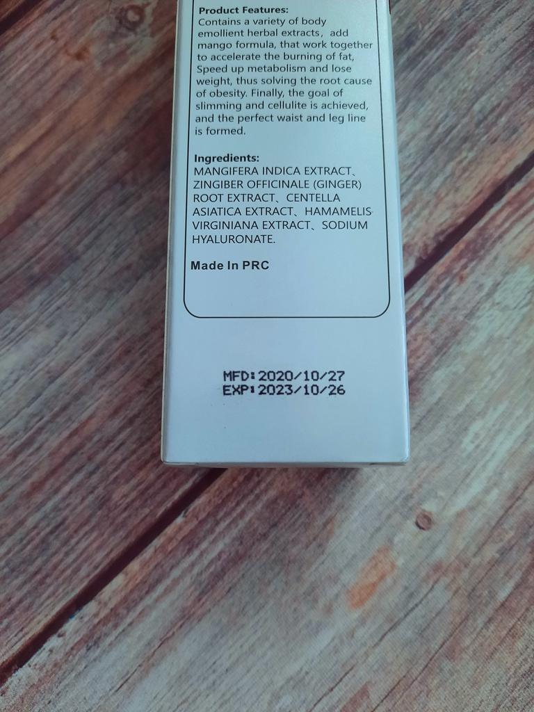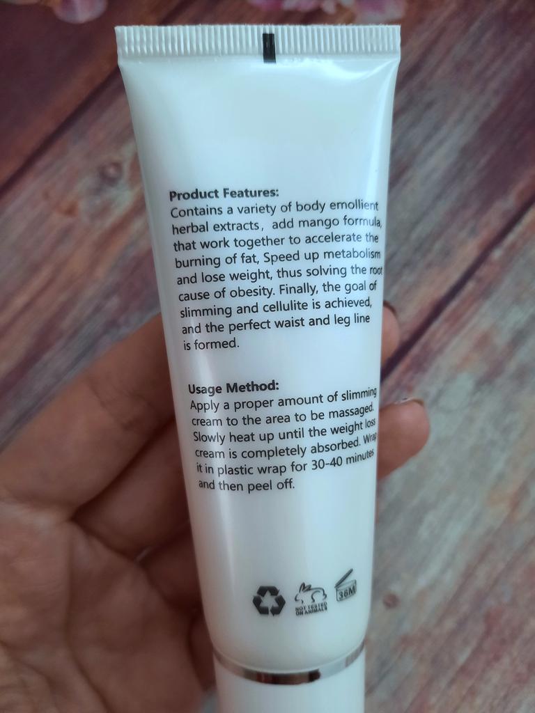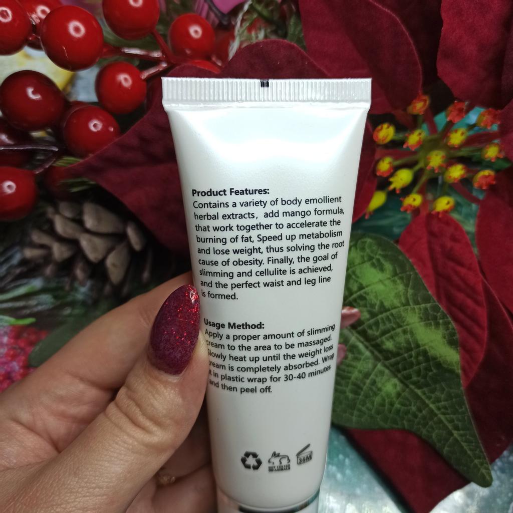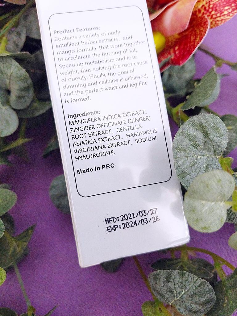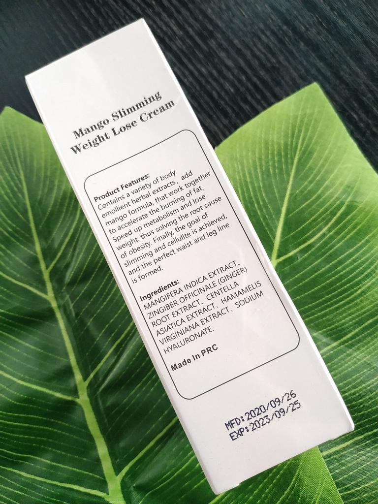 Mango slimming reducing cream It is a natural product to help fight cellulite in slimming processes and reduce body fat. It is an easily absorbed cream, smells good and is not sticky. The texture is nice. It comes very well sealed. It is also cruelty free since it is not tested on animals.. It is recommended to apply to the skin with a light massage and use it every day. Especially on the legs and belly. It arrived very quickly and the seller packed the product very well. He also added some samples of cream as a gift. When I finish using it I will add comments about the result.