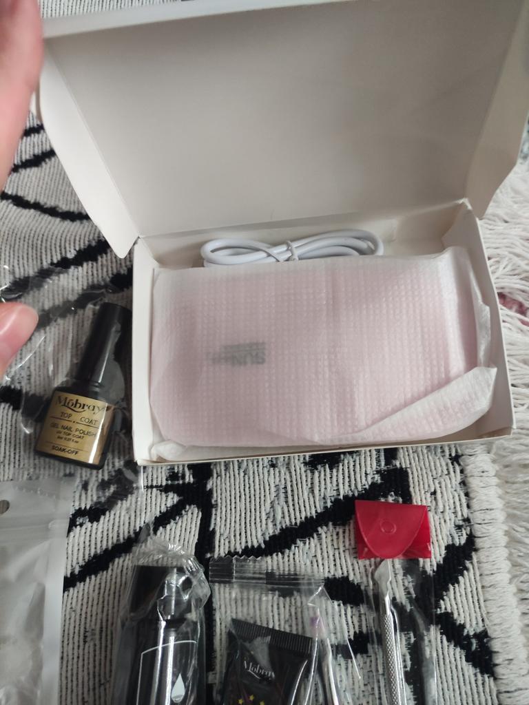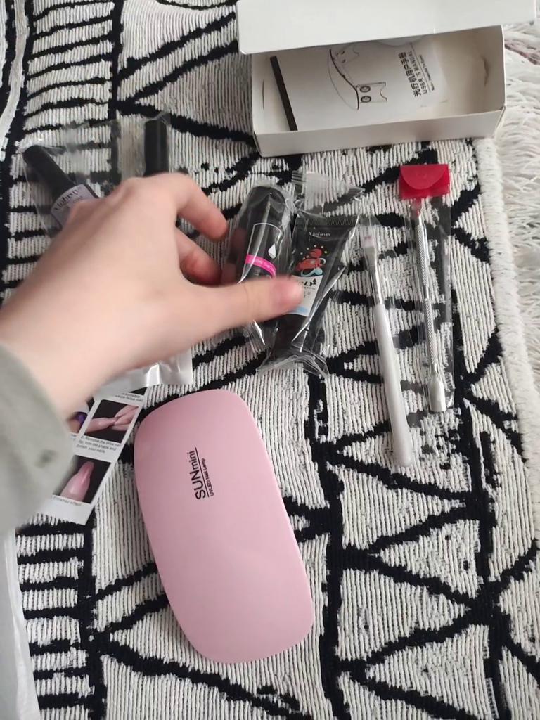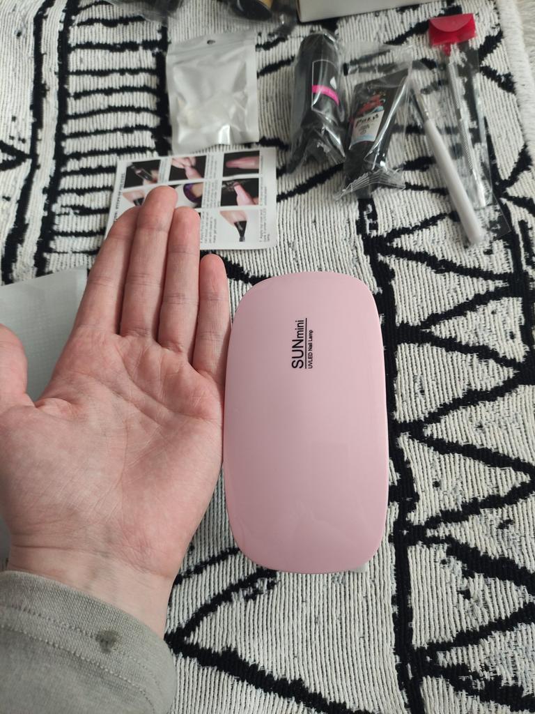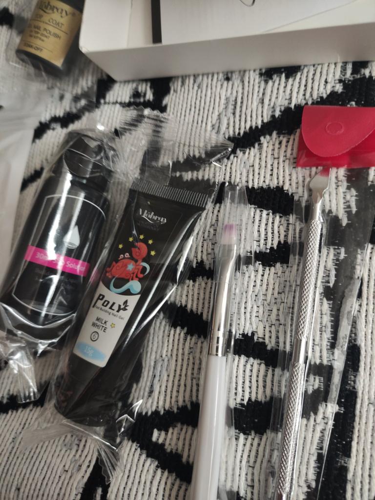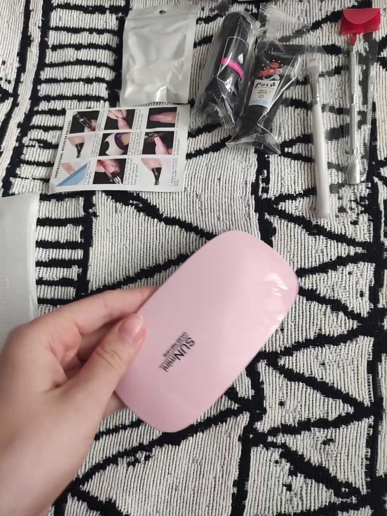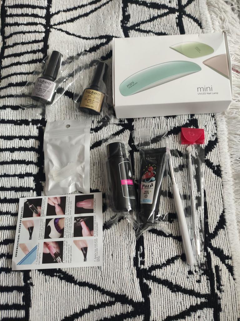 Poly Gel Nail Extension Set Brand: Mobray This is my first time trying this brand, Mobray. This set includes: 1) Poly gel, 15ml. There are 24 color options flat colors and glitters 2) Base coat, 8ml 3) Top coat, 8ml 4) Slip solution, 30ml 5) Nail forms 6) Mini UV lamp. It starts operating when long pressed. At first i thought it's broken or something, then i tried long-pressing the button. One press lights up for 1 minute. If you need longer than that, you can keep pressing as much as you need. It is very small, like a regular smart phone size. It has legs to place on a desk. It can also be used when legs are closed. It has a long USB cable. It doesn't come with a plug, which is a general thing for many devices. There is a manual for the lamp. 7) Brush to form poly gel in nail forms. 8) Cutter and cuticle tool All come in separate sealed packages. There is an instruction brochure. I especially liked the transparent glitter i chose. It gives a beautiful effect on bare nails. I can definitely recommend this brand and the store.