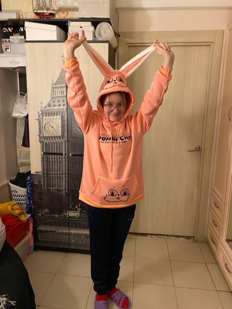The only good thing about this hoodie are the bunny ears. It’s not oversize and it is not long and fluffy like the pictures. The quality is not the best, just a regular hoodie.