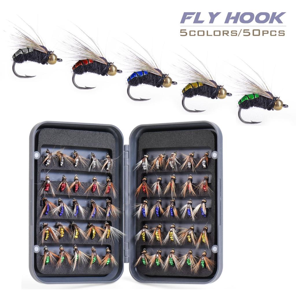 50 יחידות/קופסה 5 צבעים זבובי דיג ביוניים בעבודת יד לדיג בנחלים פורל בס עם נוצות טבעיות, מבחר זבובי דיג