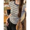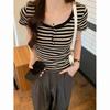 חולצת טי נשים רטרו אמריקאית עם פסים בצבעים מנוגדים על כתף ימין, שרוולים קצרים, עיצוב אביב וקיץ, גזרה צמודה, צווארון U, שרוולים קצרים "מעופפים", טופ קצר