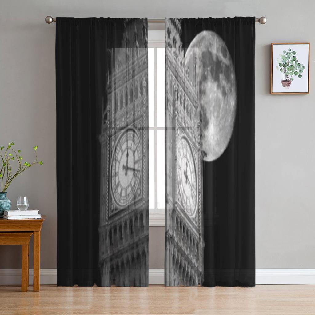 ביג בן על רקע ירח גדול וילונות טול שקופים שחור-לבן לקישוט הסלון והמטבח וילונות ווילון אורגנזה