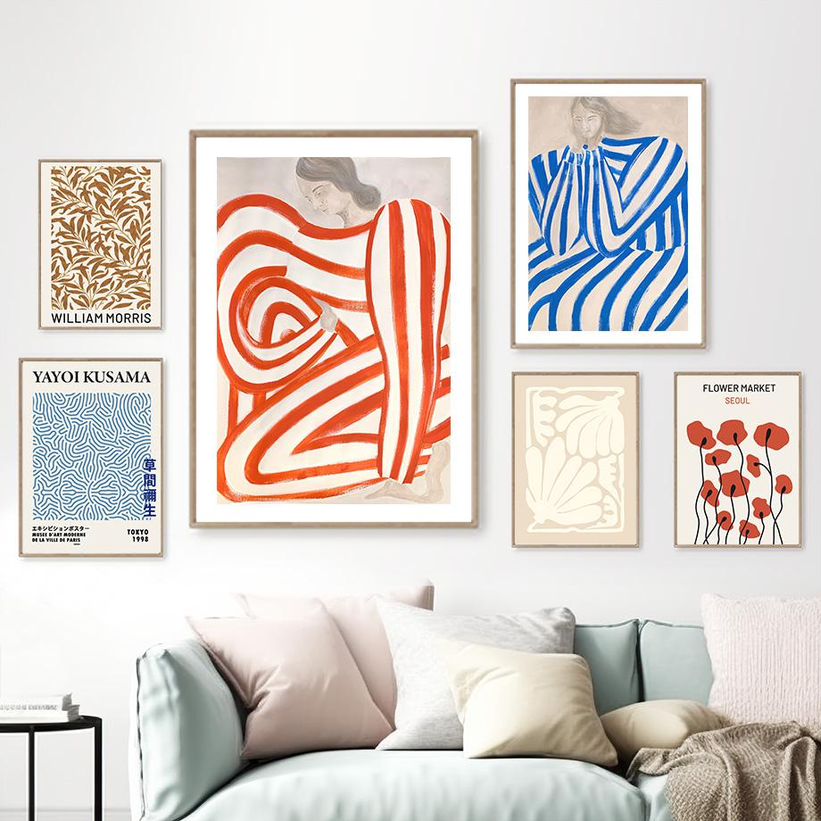 Abstract Line Striped Girl Art Print, Yayoi Kusama Canvas Painting, Flower Market Wall Pictures, Living Room, Home Decoration