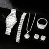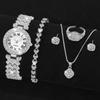 שעון נשים אלגנטי רומא אופנה שעון קוורץ נוצץ ריינסטון אנלוגי שעון יד & סט תכשיטים 6 חלקים, מתנה לאמא לה
