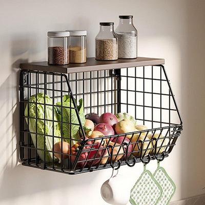 סל פירות נערם למשטח מטבח חוסך מקום, סלי רשת מתכת תלויים על הקיר עם מכסה עץ אחסון נוסף