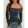 European Style Gray Striped Off-Shoulder Long-Sleeve T-Shirt for Women - Early Autumn
