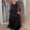 שמלת Midi צווארון מרובע לנשים שרוול פנס וינטג' שמלת נשים שמלה שיק קז'ואל שרוכים Y2k