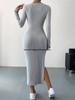 שמלת סריג ארוכה עם שרוולים ארוכים, צווארון עגול ושסע לסתיו ולחורף