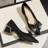 Pointed single shoes women's new thick heel fairy shoes light mouth pearl bow middle heel ladyshoes