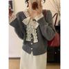 French sweet bow lace-up knitted cardigan small fragrant style early autumn small sweater jacket contrasting color college style