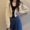Small short outer rhombus v-neck knitted cardigan women's autumn loose long-sleeved sweater small coat top